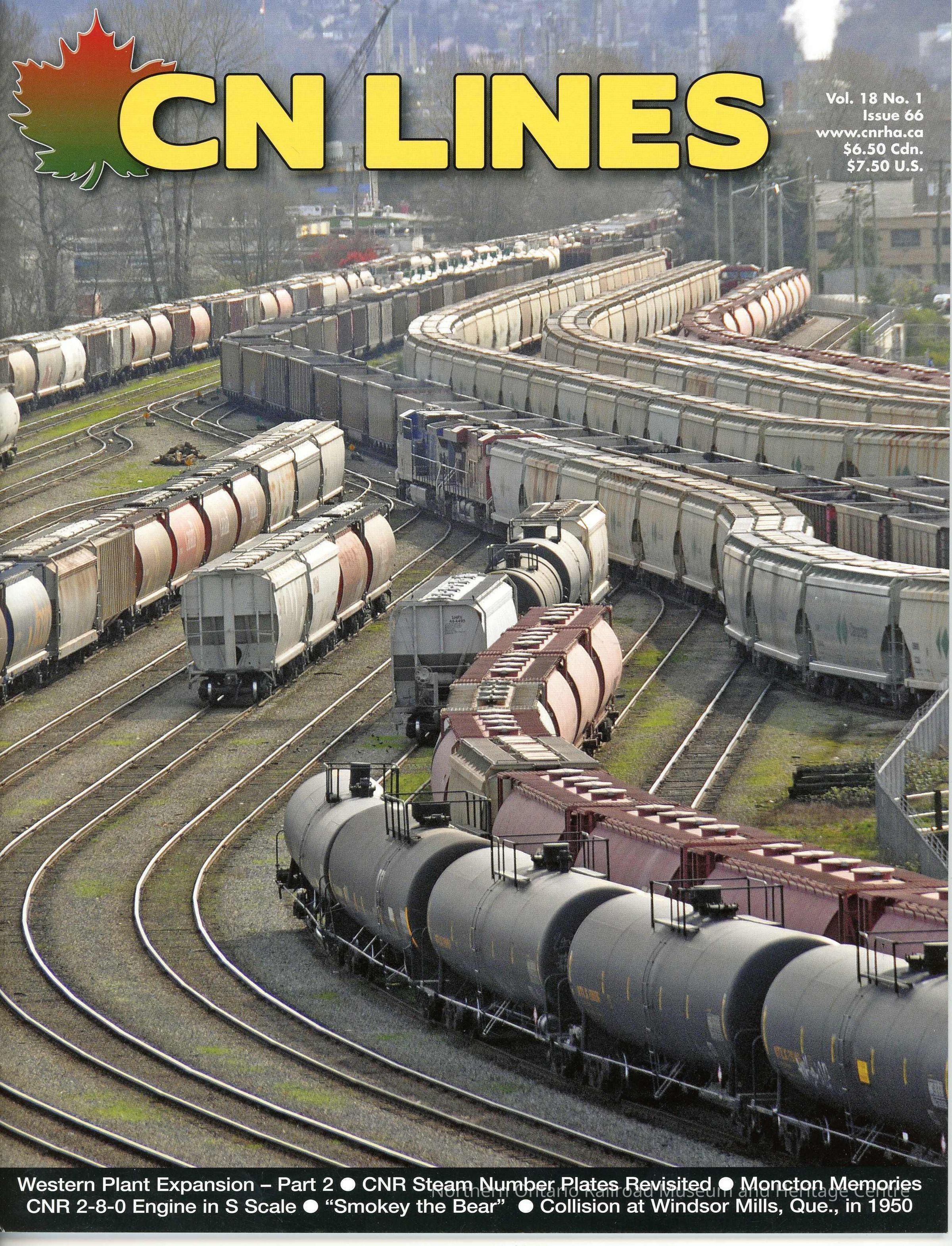 Cn Lines Magazine, Vol. 18 No. 1 Issue 66 from April 2016. Features" Western Plant Expansion pt. 2 - CNR Steam Number PLates Revisited - Moncton Memories - CNR 2-8-0 Engine in S Scale - "Smokey the Bear" - Collision at Windsor MIlls, Que., in 1950" as Cover StoriesOther Names and Numbers
