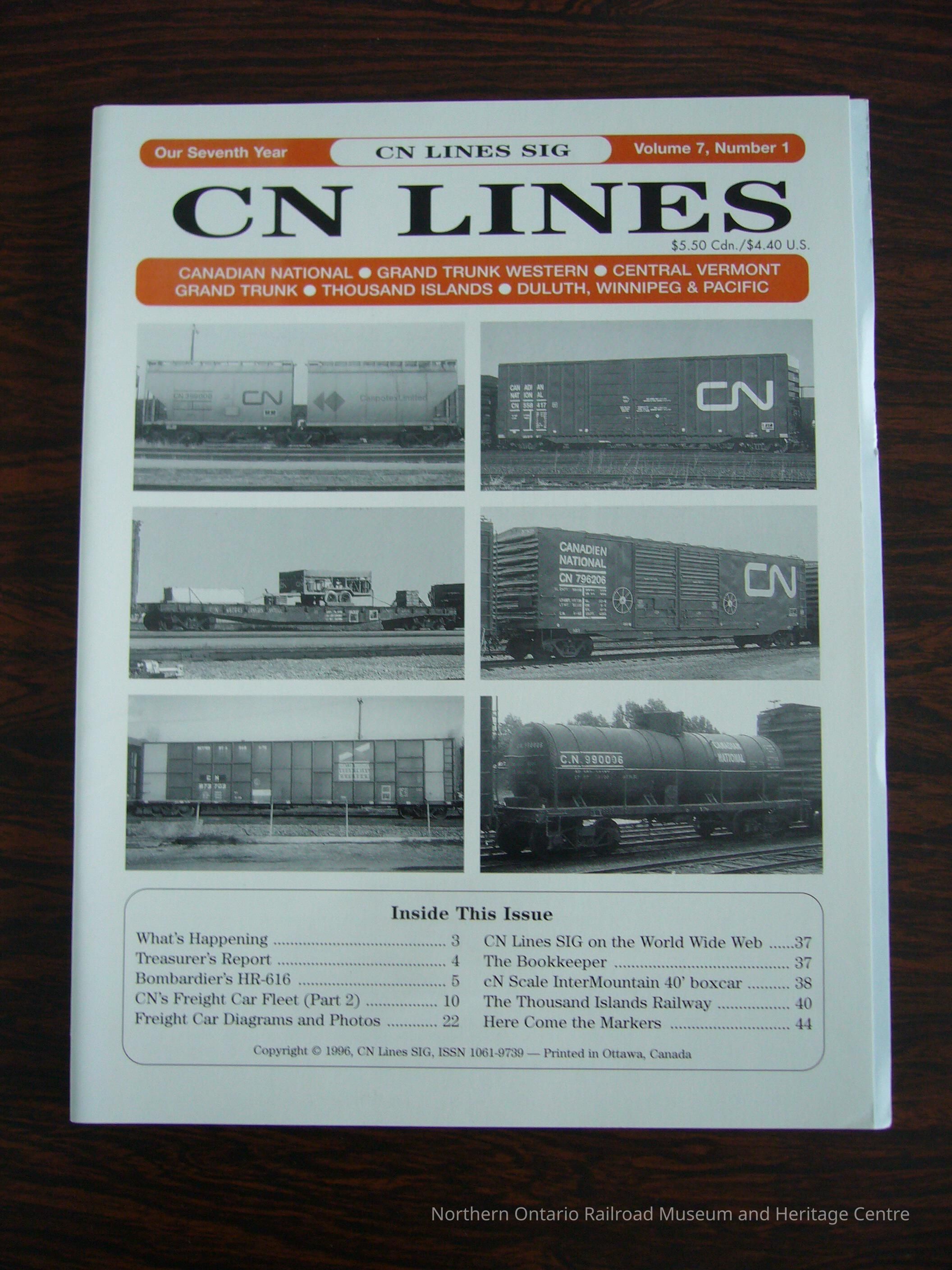 In this issue: Bombardier's HR-616, CN's Freight Car Fleet (Part 2), Freight Car Diagrams and Photos, CN Lines SIG on the World Wide Web, cN Scale InterMountain 40' boxcar, The Thousand Islands Railway. 1996.Collection