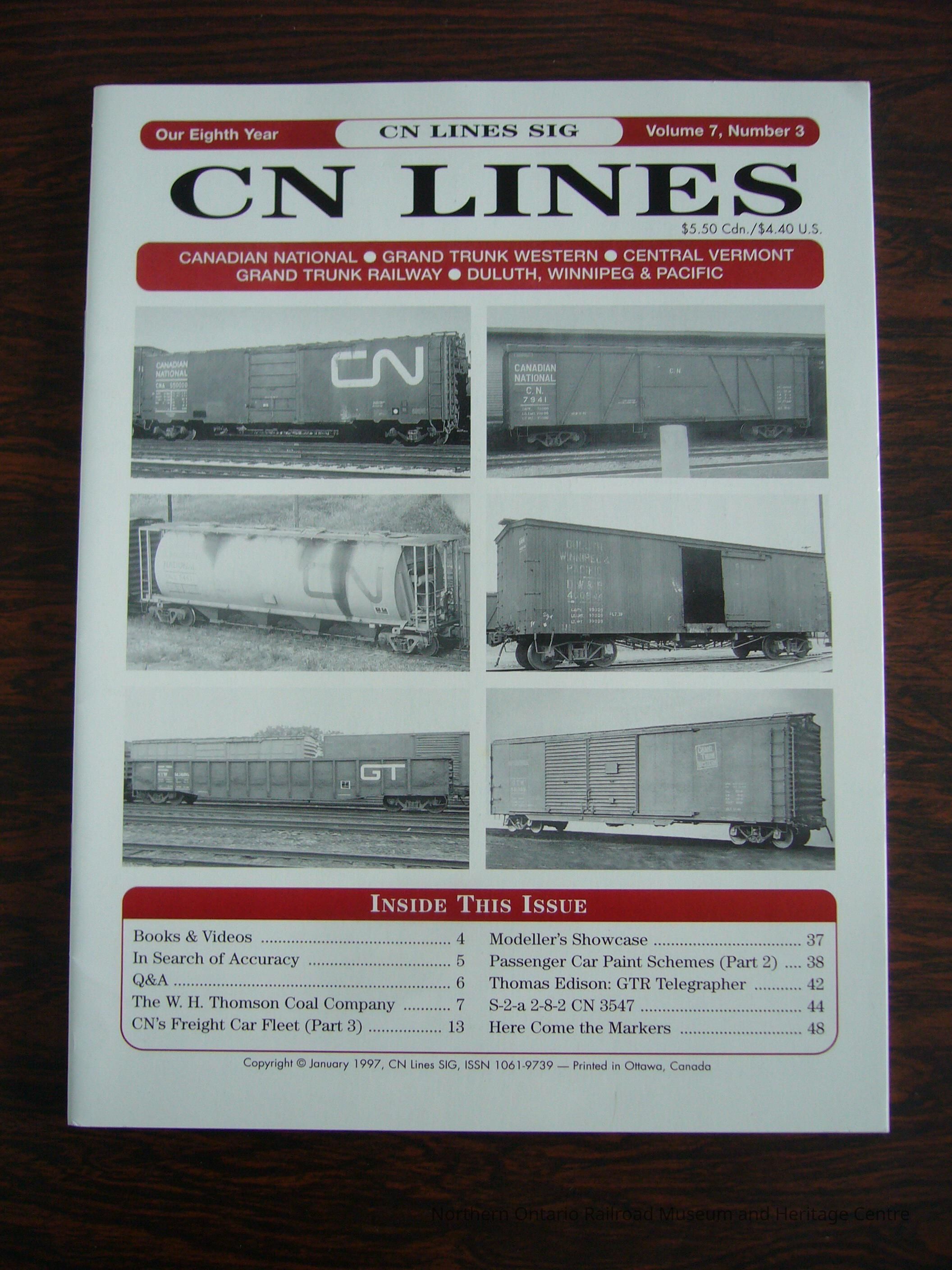 In this issue: The W.H. Thomson Coal Company, CN's Freight Car Fleet (Part 3), Modeller's Showcase, Passenger Car Paint Schemes (Part 2), Thomas Edison: GTR Telegrapher, S-2-a-2-8-2 CN 3547, Here Come the Markers. January 1997.Collection