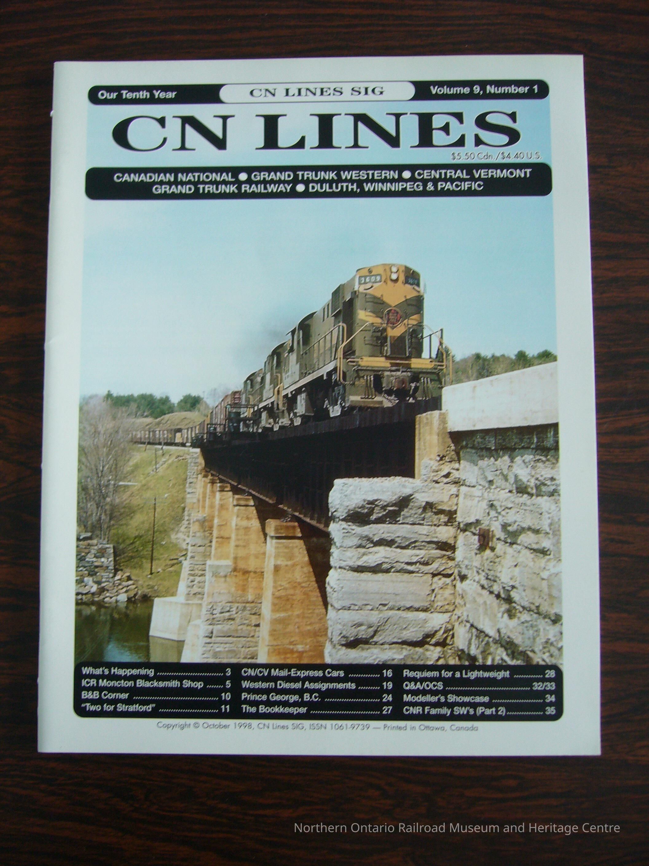 CN Lines magazine is published three times per year by CN Lines SIG, "an international self-sustaining operational research and historical society that exclusively focuses on the Canadian National family of railways and actively promotes the art of modelling them accurately. The CN Lines SIG is not affiliated with Canadian National." (taken from inside front cover)