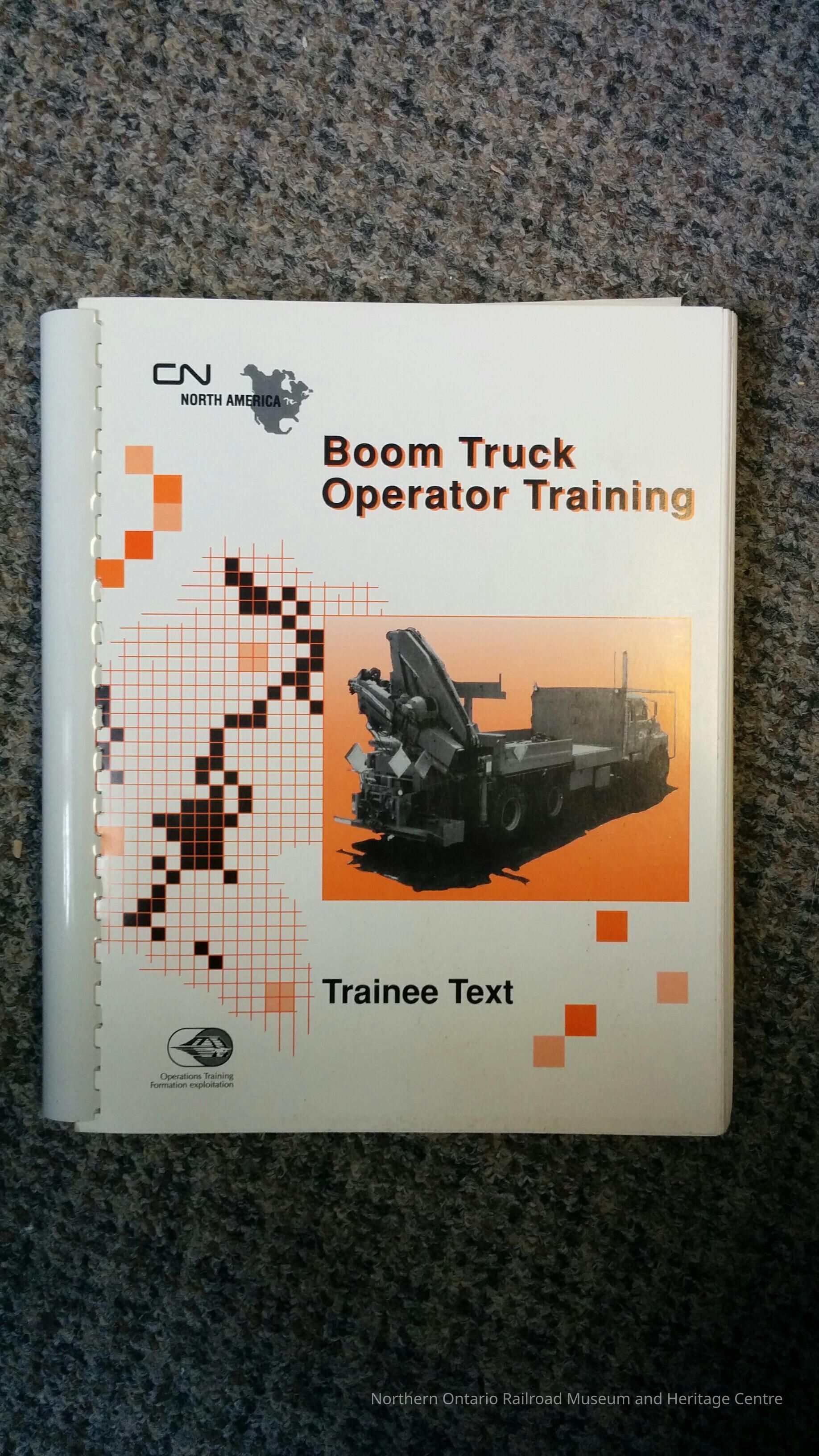 Book, training manual used by Canadian National to train employees to operate boon trucks. It covers: regulations and responsibilities, safety guidelines, basic components and maintenance, international and railway hand signals, rigging hardware, capacity load charts, FASSI model F115.22: boom truck, FASSI model F280.22: frog truck, HIAB model 100 AW: CN boom truck, FASSI model f280.22: 1991 Bridge Truck, Set-up procedures.