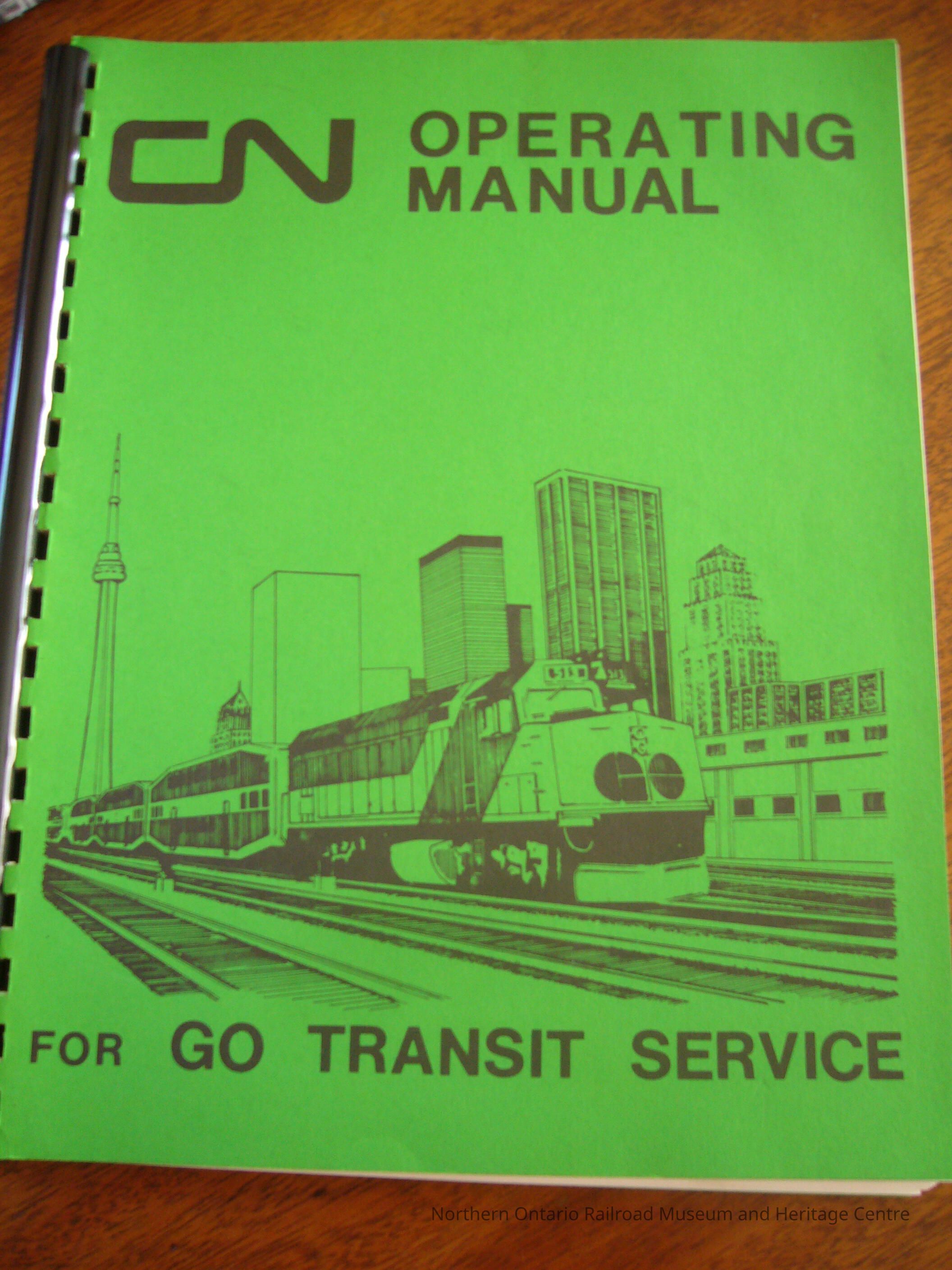Canadian National branded operating Manual for the GO transit service in 1986. Features a letter from the Assistant Superintendent, W.R. Radcliffe. It discusses general information then by use of an index it directs the reader to their desired information.