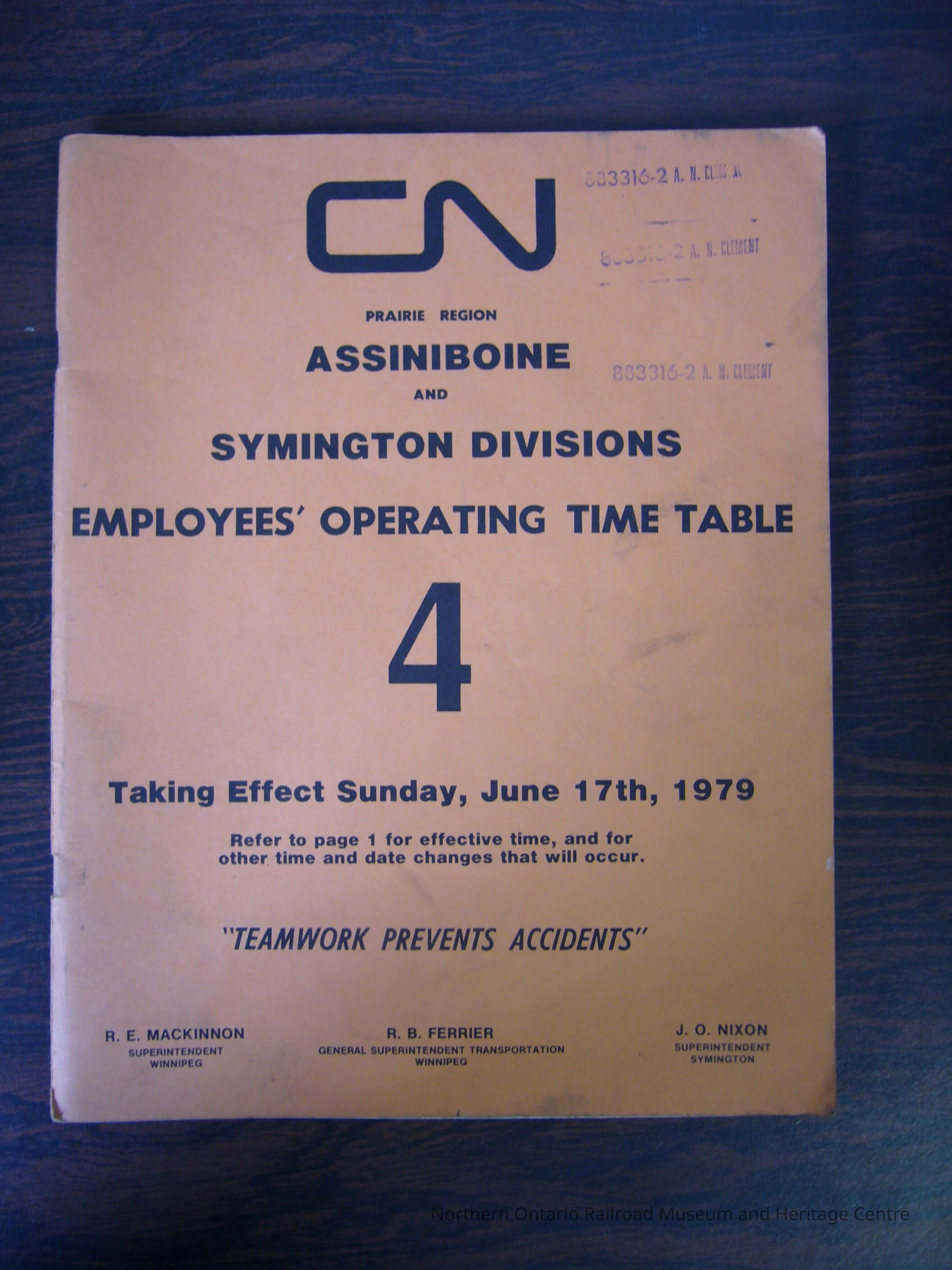 CN Prairie Region Assiniboine and Symington Divisions Employees' Operating Time Table 4, Taking Effect Sunday, June 17th, 1979Entry/Object ID