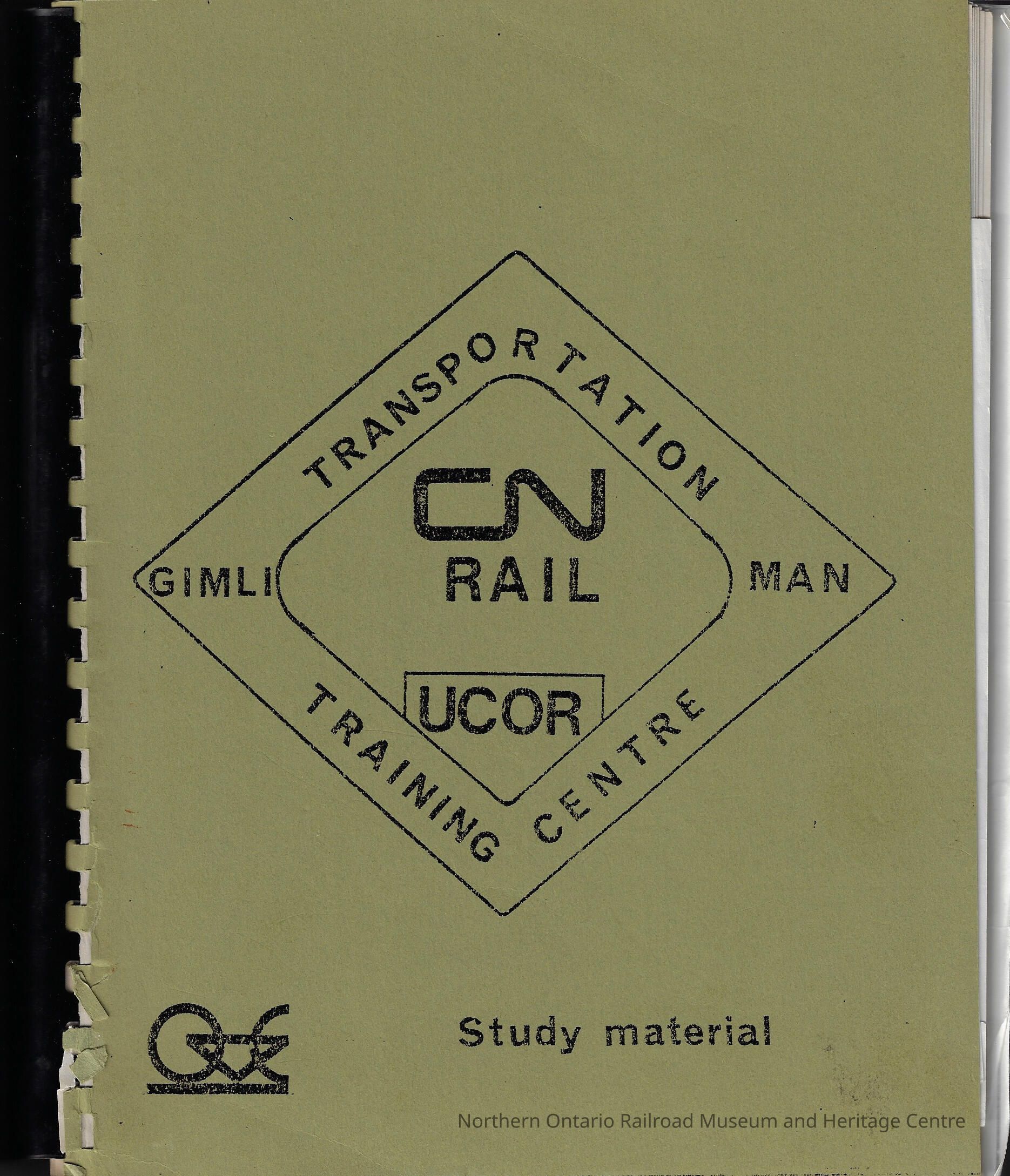 Book, manual of study material for Canadian National employees on signal training, specifically in Gimli Manitoba. The study material is presented in the form of a mock exam featuring questions that may occur on their exam. It is broken down into twenty two sections including: general notice rules and definitions, rules 1-6, rules 7-35, rules 40-48, rules 71-89A, rules 90-97, rules 98-103, rules 104-104E, rules 105-114, rules 201-223, forms of train orders A to X, rules 151 and 152 and rules 251-257, rules 261-273, rules 281-293 signals, rules 321-323 section 2 system special instructions (MBS), rules 401-405, rules 505-518, rules 605-673, 696 general operating instructions, track units as trains: item 3 system special instructions, 835 regulations for the protection of track units and maintenance work, dangerous commodities.