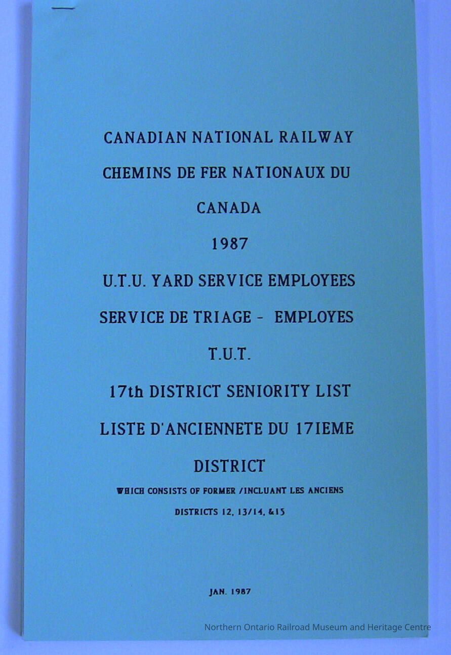 CN Rail Great Lakes Region: 17th District Seniority List, January 1987Description