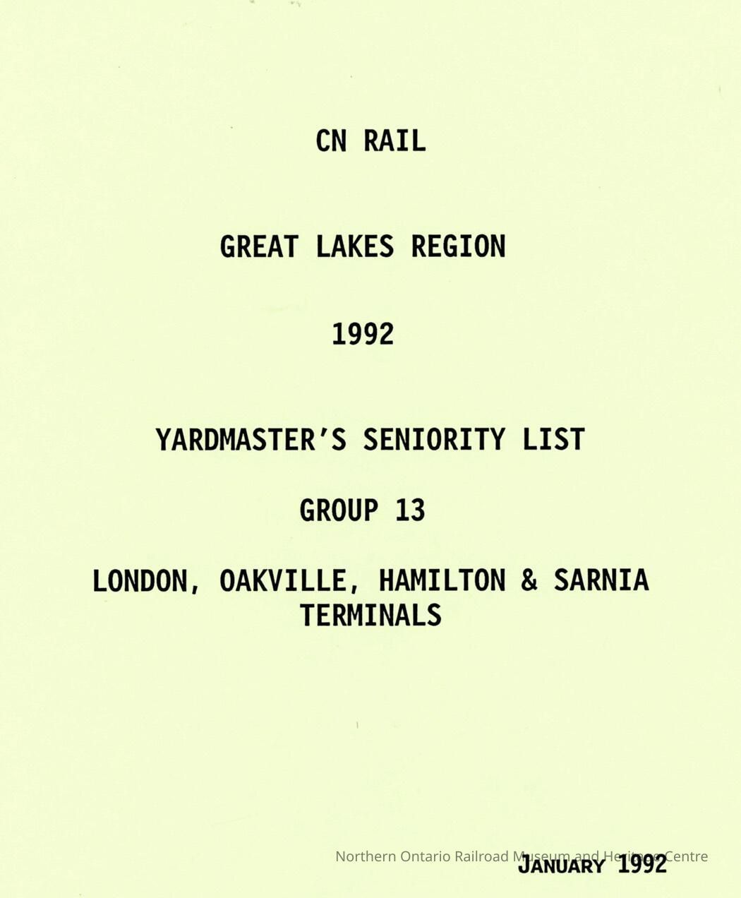CN Rail, Great Lakes Region, 1992, Yardmaster's Seniority List, Group 13, London, Oakville, Hamilton & Sarnia Terminals, January 1992.Collection