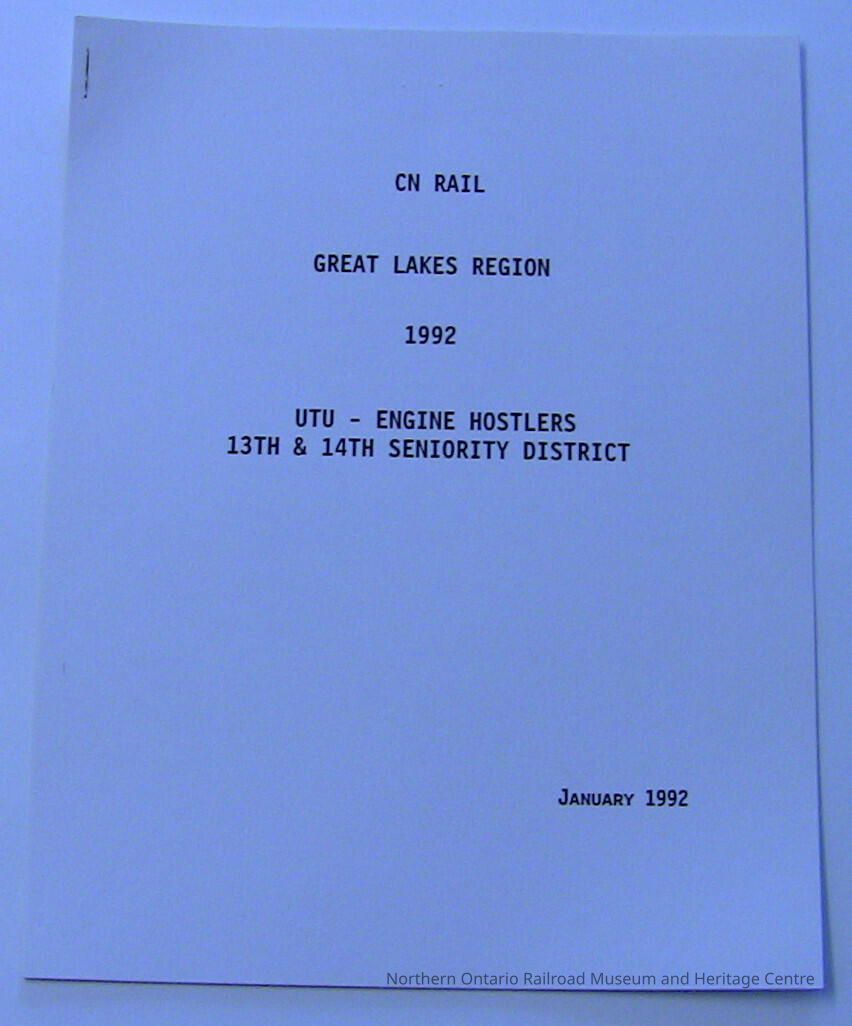 A 1992 seniority list for CN United Transportation Union Engine Hostlers in the 13th and 14th Seniority Districts of the Great Lakes Region.Collection