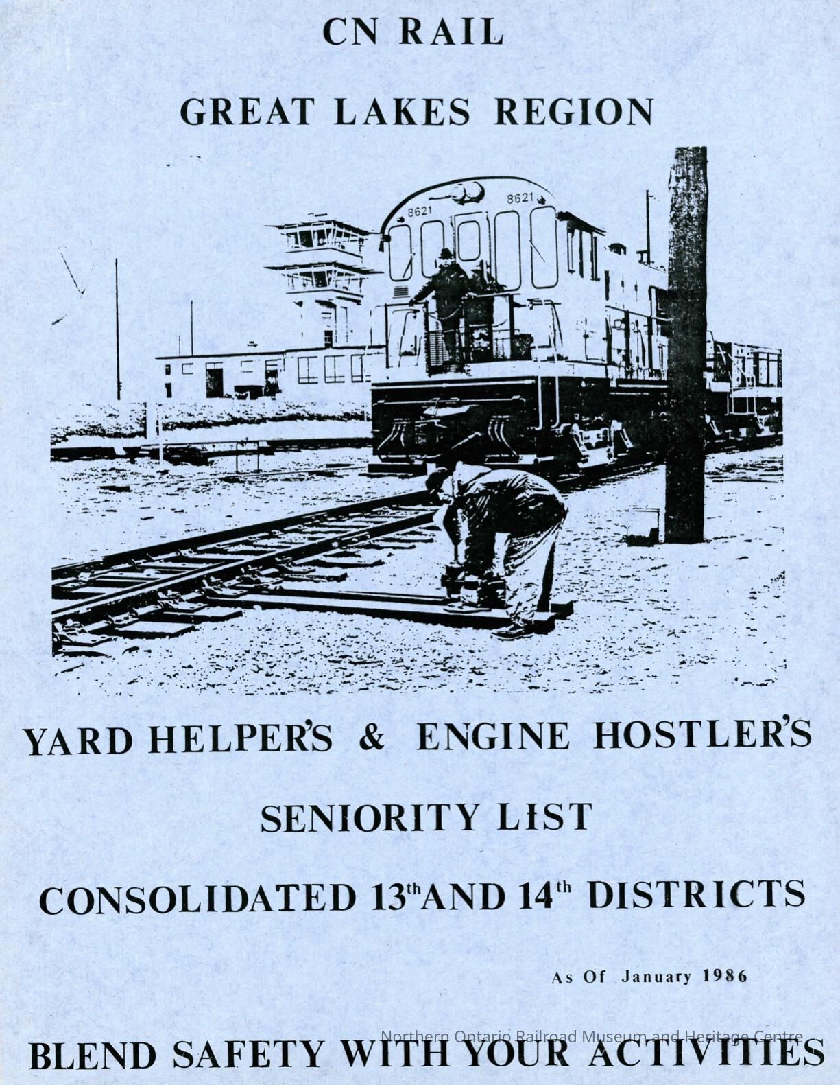 CN Rail, Great Lakes Region, Yard Helper's and Engine Hostler's Seniority List Consolidated 13th and 14th Districts, as of January 1986.Collection