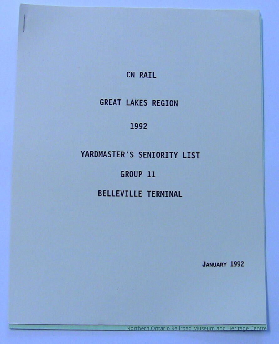 CN Rail Great Lakes Region Yardmaster's Seniority List, Group 11, Belleville Terminal, January 1992Description