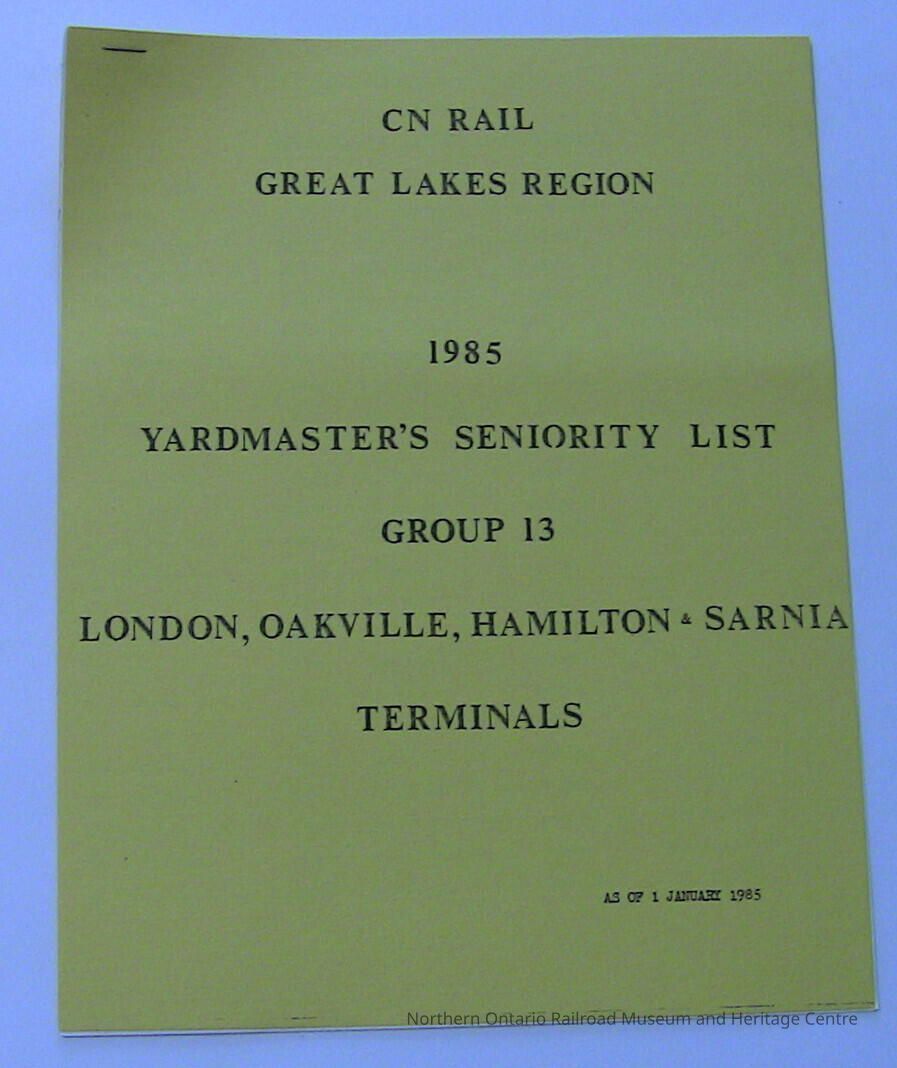 A 1985 seniority list for CN Yardmasters at the London, Oakville, Hamilton and Sarnia terminals.Collection