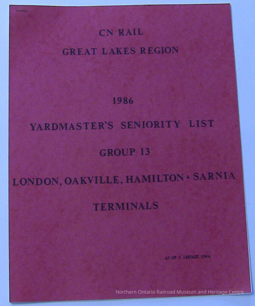 A 1986 seniority list for CN Yardmasters at the London, Oakville, Hamilton, and Sarnia Terminals.Collection
