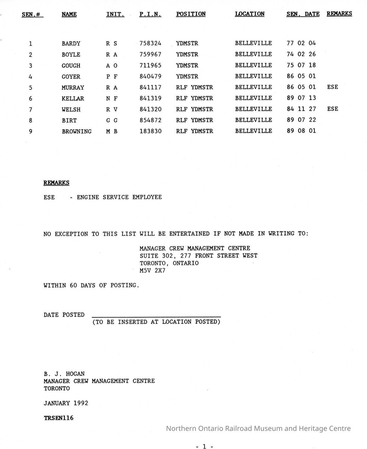 CN Rail, Seniority List, January 1992.Collection