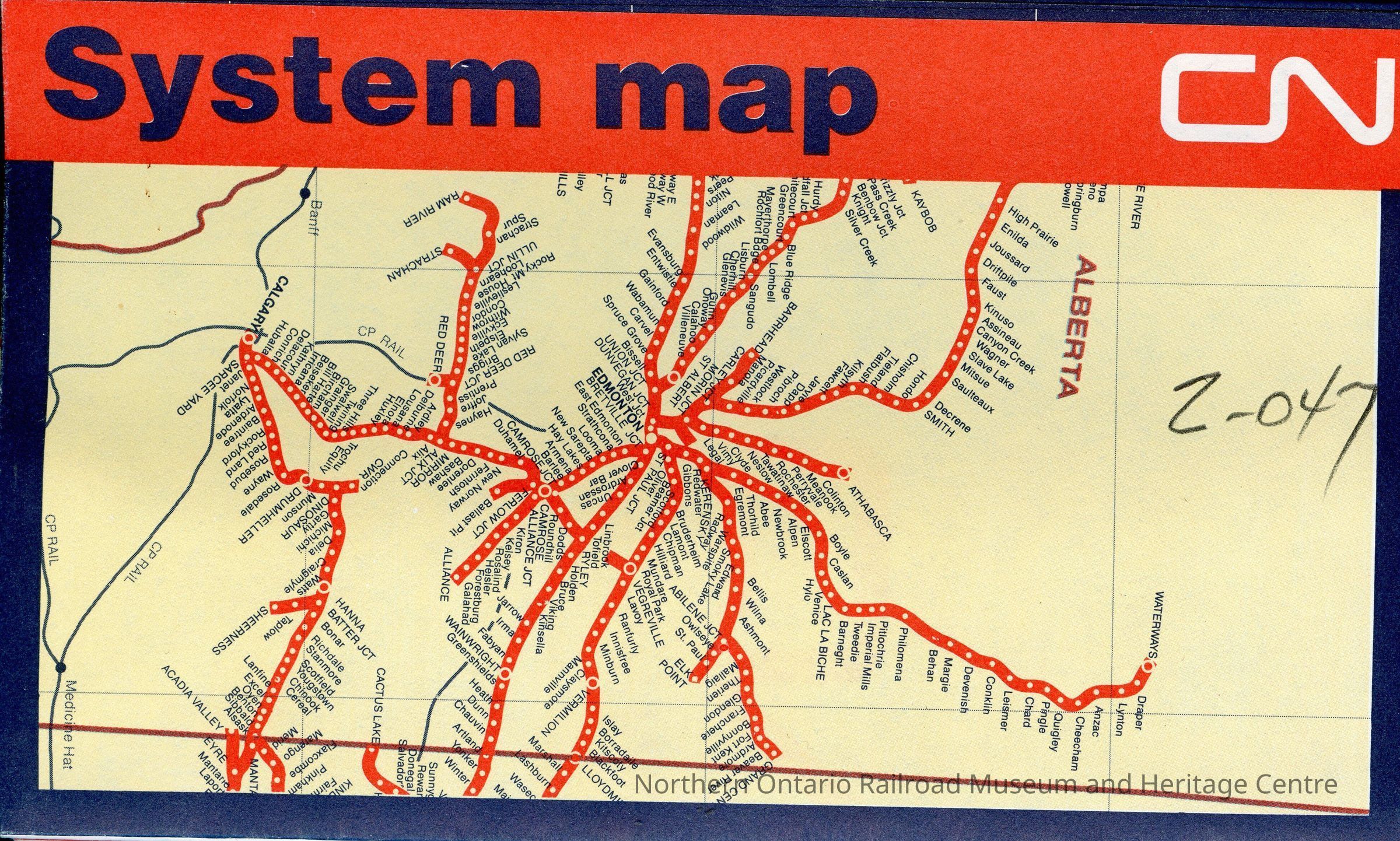 A systems map for Canadian National railways. Features both US and Canadian cities including: Chicago, Windsor-Detroit, Montreal, Moncton, Halifax, etc.