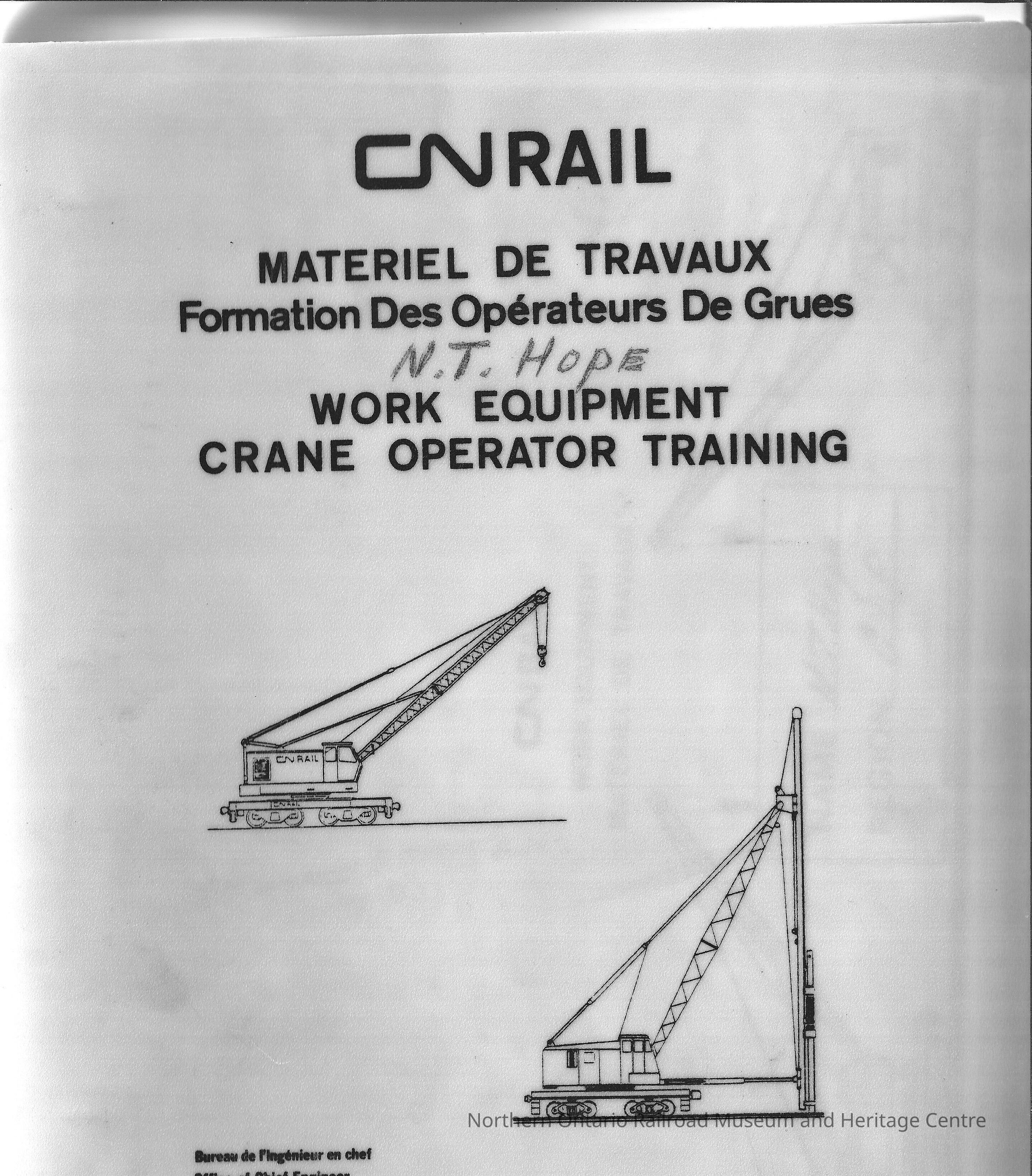 Book, training manual for Canadian National employees on work equipment, specifically crane operating in the Great Lakes Region. It includes: preparation and introduction, inspection and maintenance, general operation, crane description, questionnaire, operation light loads, operation heavy loads, operation pile driver, preparation, radio presentation, responsibilities, slides, student transportation status, rules for the classrooms, trainee guidelines, accident prevention.