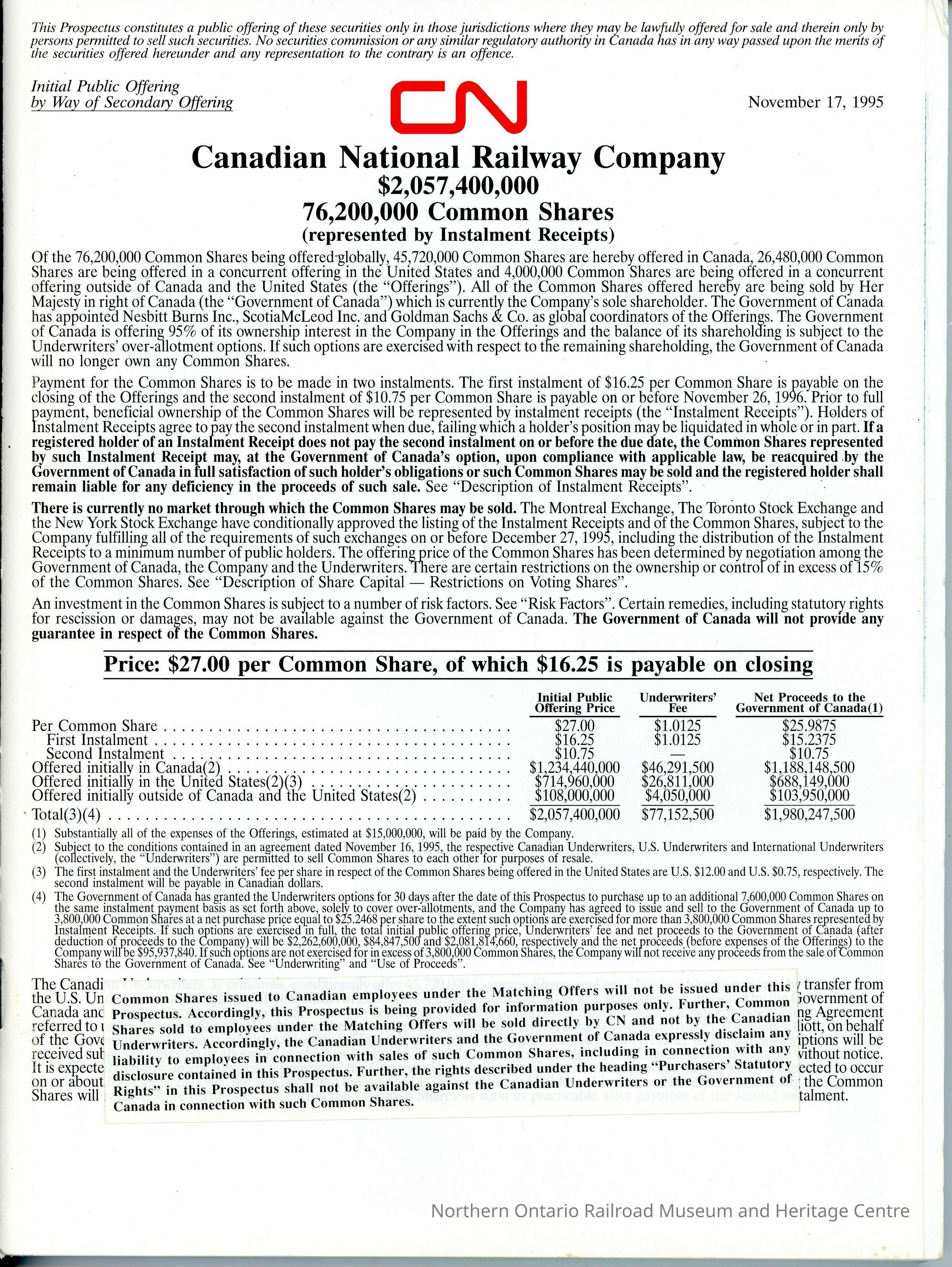Cn Railway Company Common Shares Information Packet (Initial Public Offering)Description