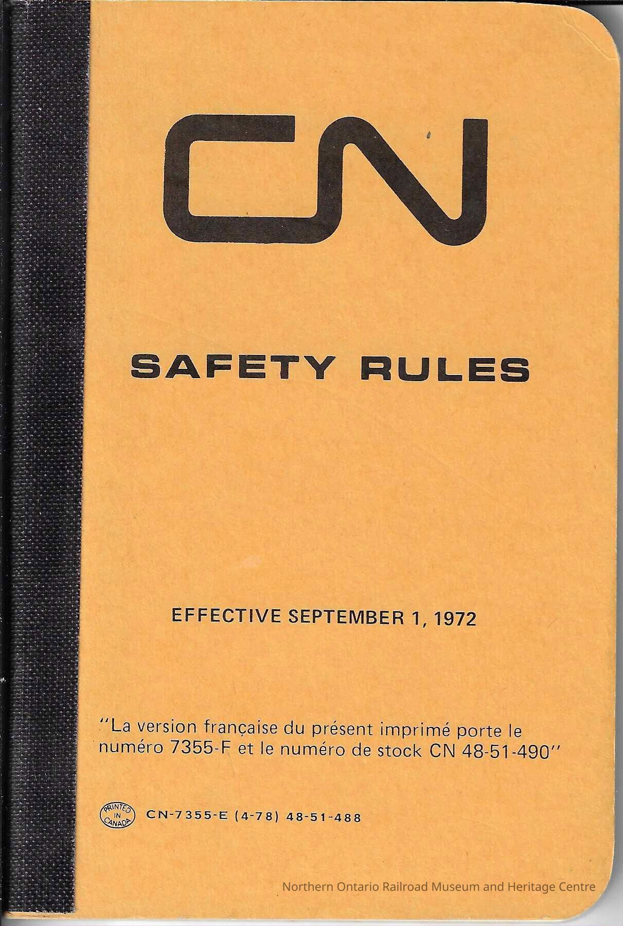 Book, safety rules published by Canadian National, this book would have been provided to employees. It covers: general rules, office safety, clothing and footwear, personal protective equipment, fire precautions, housekeeping, tools and equipment, working on or about tracks, getting on or around locomotives cars or trains, working on or around locomotives cars or trains, operating hand brakes, operating track switches, working on locomotives, working on cars, handling and storage of materials, trucking material freight etc, express sheds stores etc, garages, customer and catering services, working on or about machinery, grinding wheels, electrical circuits equipment etc, cutting and welding equipment, gases acids explosives molten metals, manhole well trench sewer turntable pit or other evacuation, ladders trestles platforms or scaffolds, cranes derricks hoists, self-propelled trucks or tractors, poles, jacks, pipe lines, mechanical refrigerating or air conditioning units.