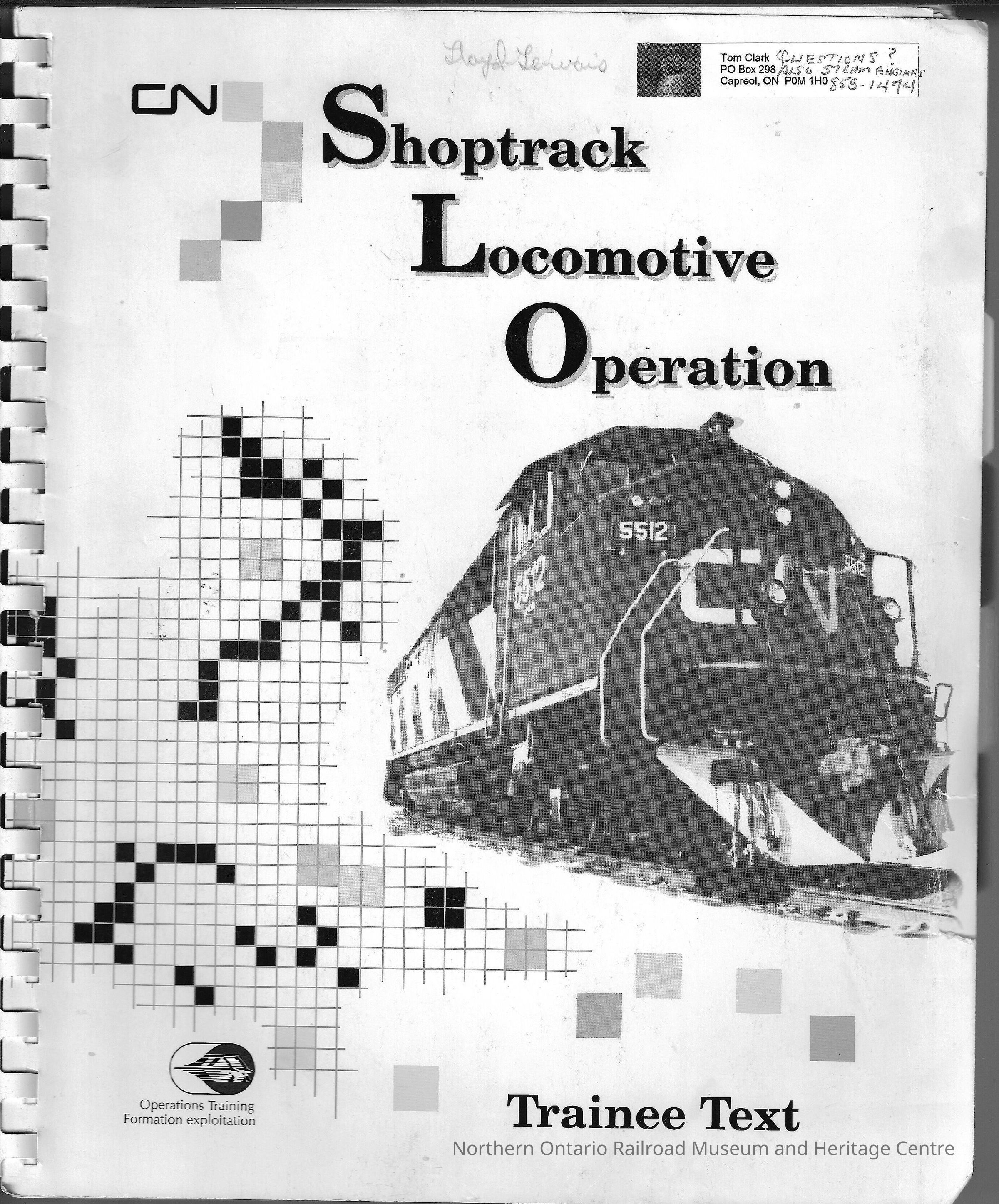 Book, Canadian National shoptrack locomotive operation manual. This manual is meant for training for new engineers and engineers in training. Includes: safety guidelines, accident prevention, diesel shop, pit areas, locomotive cab, getting on a locomotive, getting off a locomotive, shop tracks, introduction to locomotives, definitions, front and rears of locomotives, unit numbers and classifications, component numbers, locomotive air brakes, independent valves, automatic valves, valves and cut-out cocks, control stands, valves, brake cut offs, reseting safety controls, gauges, cab controls, control stands, locomotive movements, signals, switches and derails.