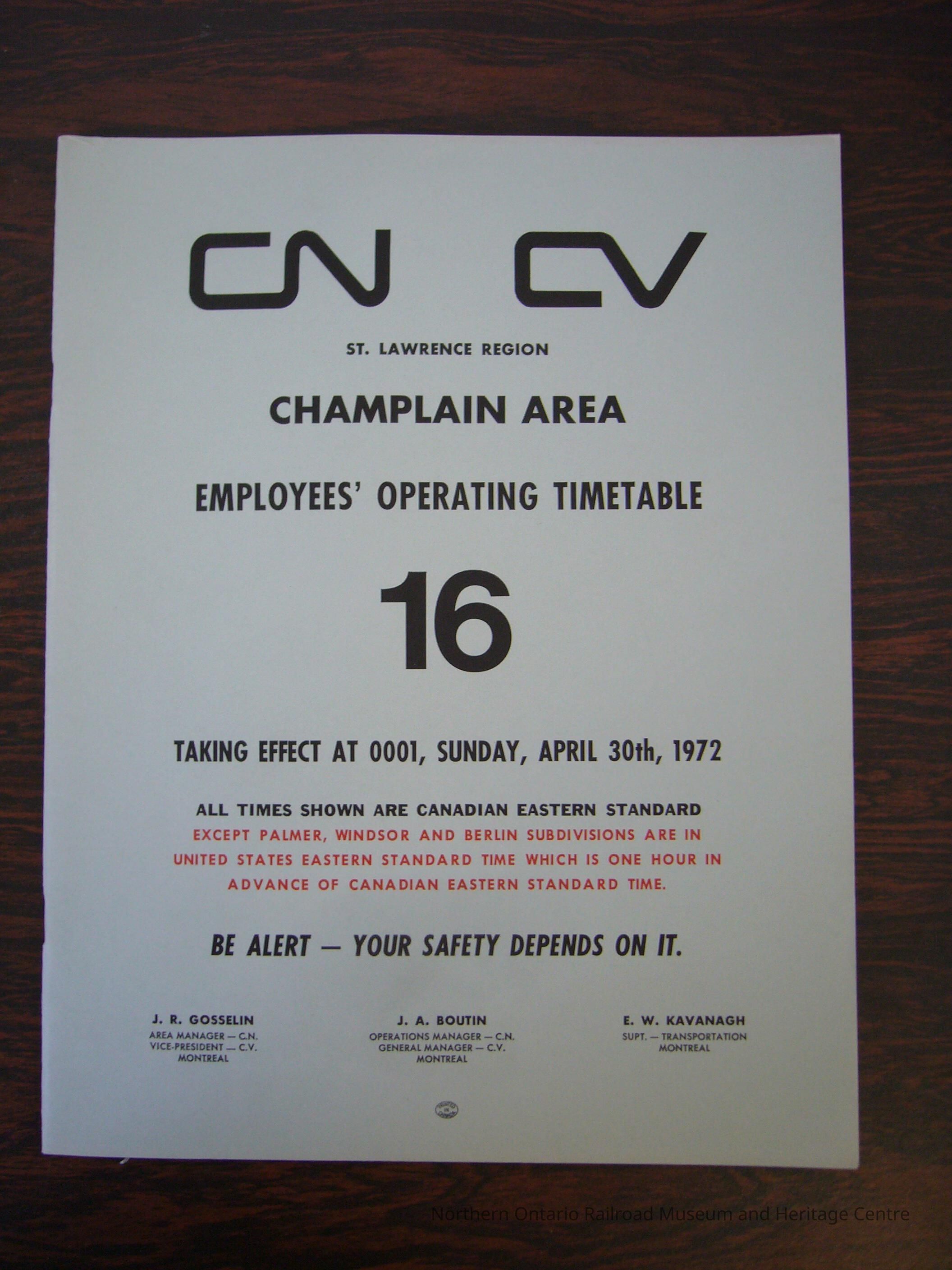 CN St. Lawrence Region Champlain Area Employees' Operating Timetable 16, Taking Effect Sunday, April 30th, 1972.Collection