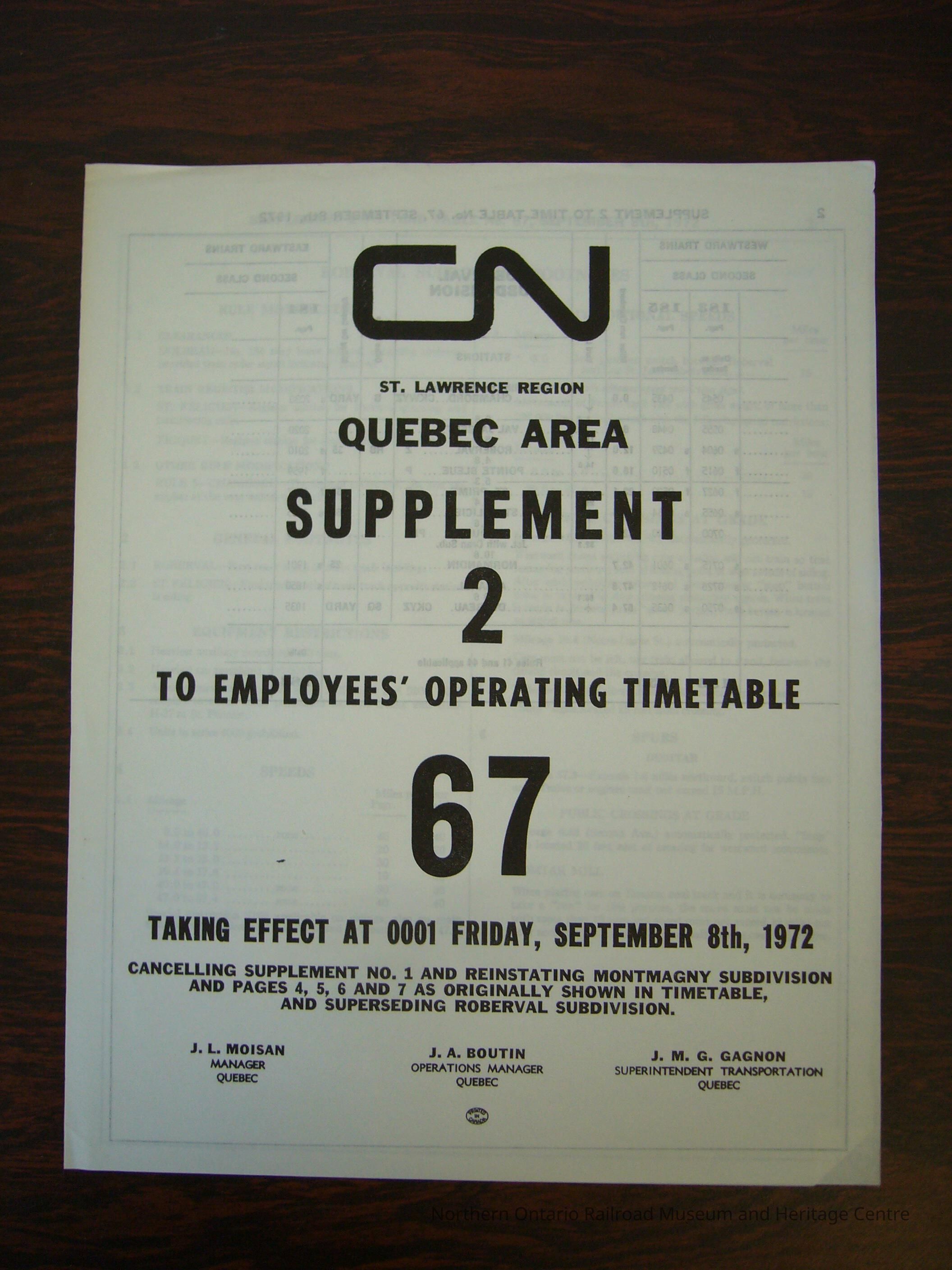 CN St. Lawrence Region Quebec Area Supplement 2 to Employees' Operating Timetable 67, Taking Effect Friday, September 8th, 1972.Collection