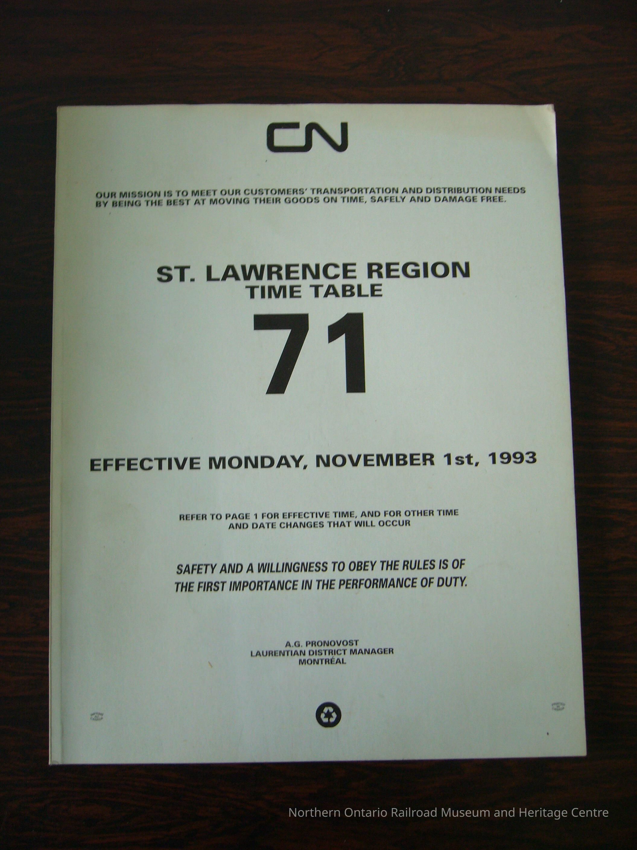 CN St. Lawrence Region Time Table No. 71, Effective Monday, November 1st, 1993Collection