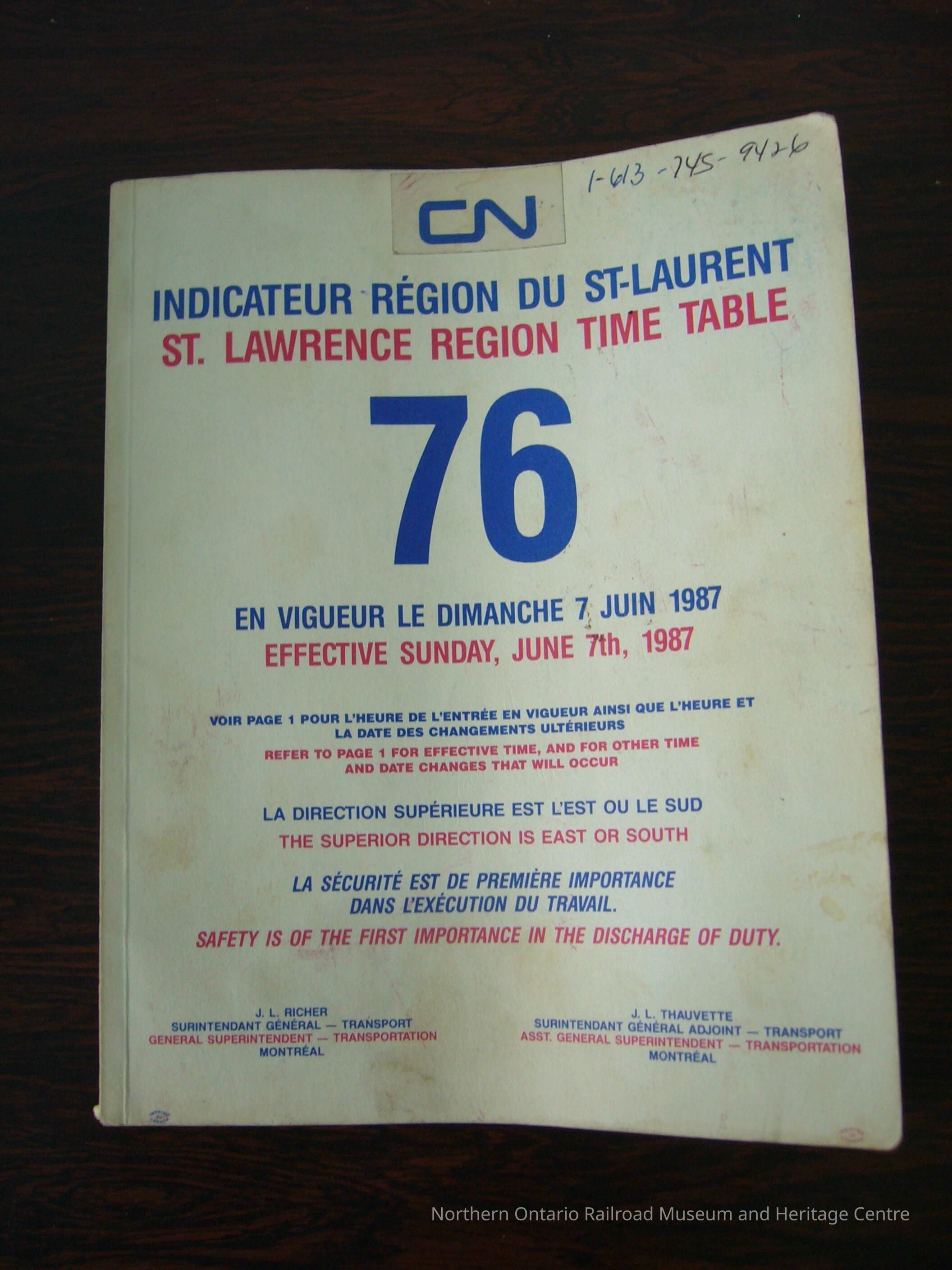 CN St. Lawrence Region Time Table No. 76, Effective Sunday, June 7th, 1987Collection