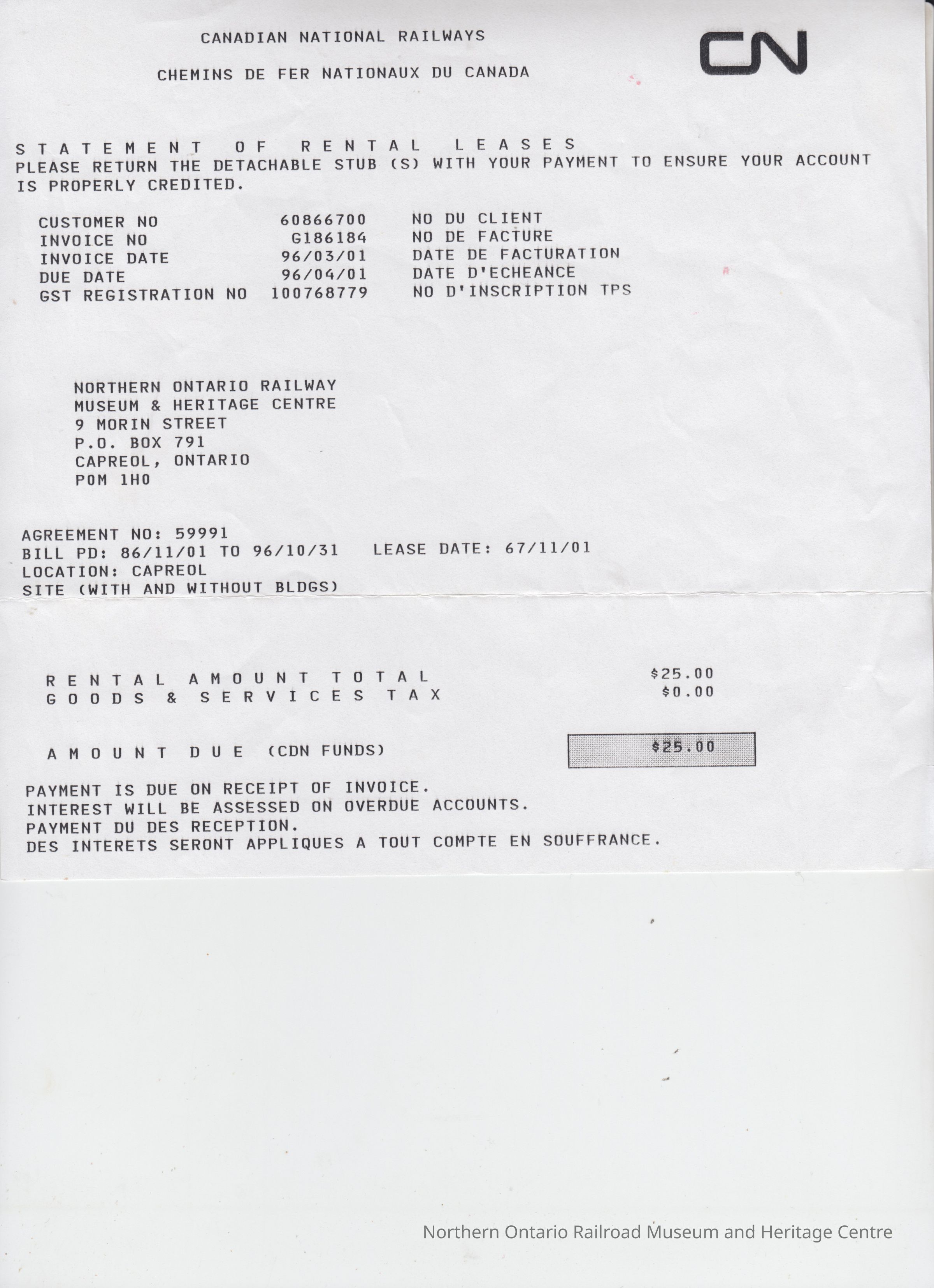 CN Statement of Rental Leases to NORMHC, March 1 1996. $25.00 for the lease rate of Prescott Park LandCollection