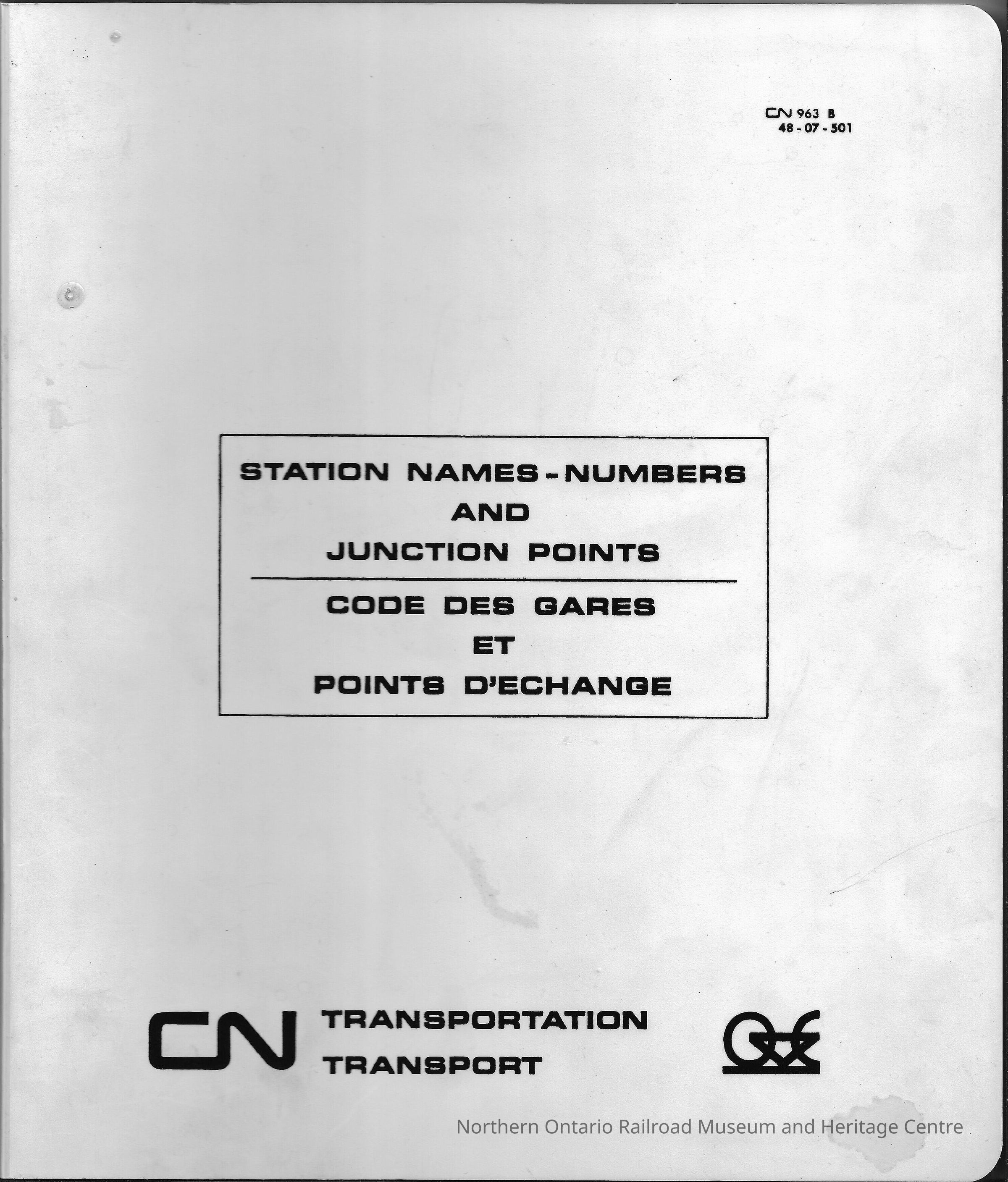 Plastic covered binder, contains a list of Canadian National's station names, numbers and junction points. It is in both English and French. The first page features a "check sheet" allowing the user check the correctness of the document.