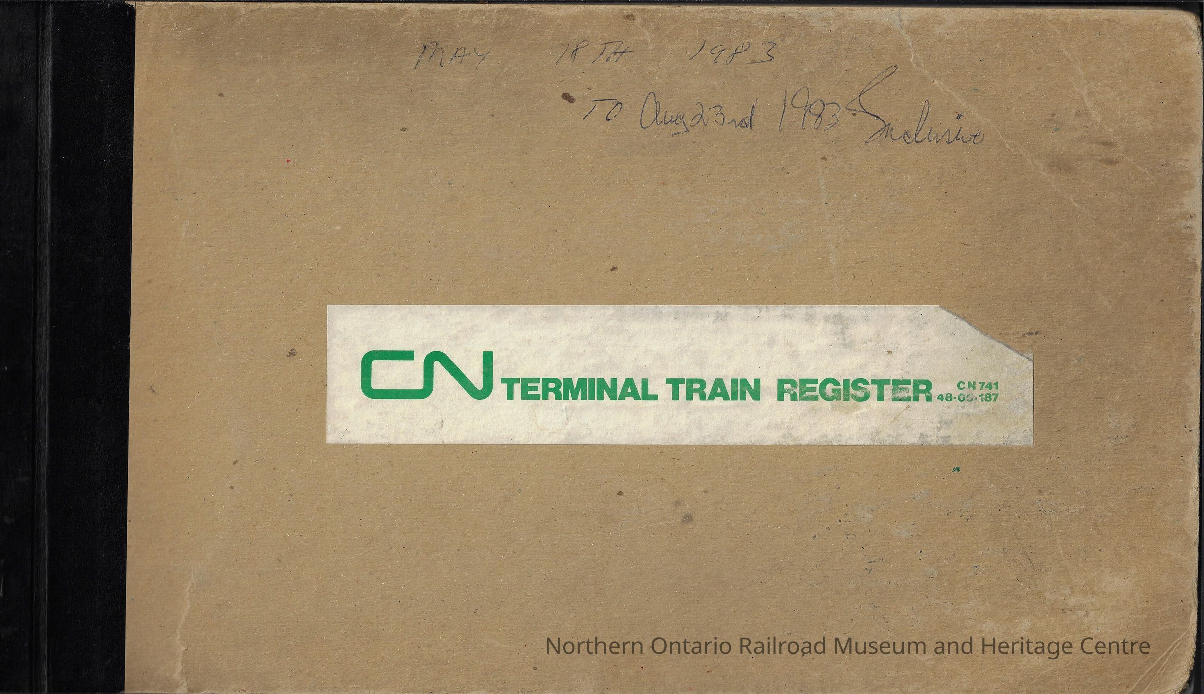 A register book from the Canadian National station in Capreol for May to August 1983. Contains the names of all of the workers, the designation of each train, the leading unit number, signals displayed, time ordered, time watch compared with standard clock, variation of time, leaving time, cars leaving: passenger freight loads empties and tonnage, signature of conductor, and trailing unit numbers, journal number and remarks for each train that came through between May 18th and August 23rd 1983.