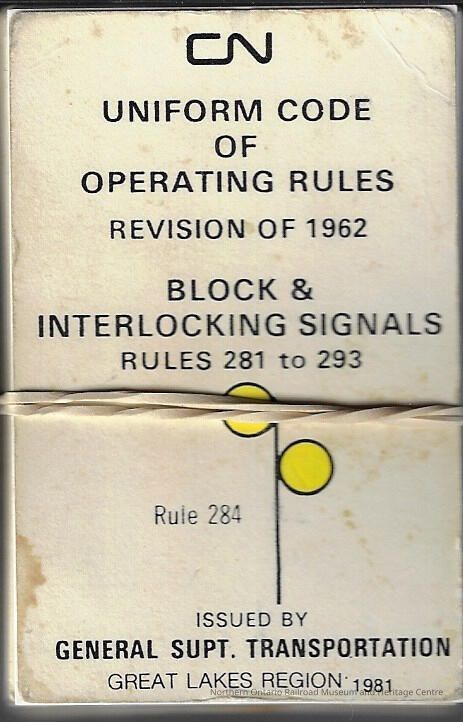 Original documents used by Canadian National employees to train on the uniform code of operating rules' block and interlocking signal rules 281-293.