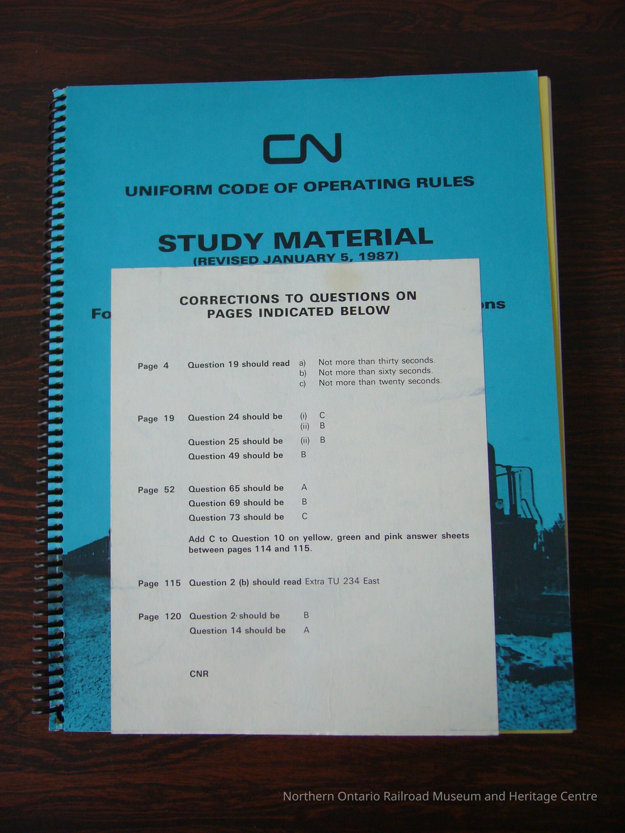 Book, study guide for Canadian National's uniform code of operating rules. The book contains a mock/practice test for the later exam on the operating rules. There is also an answer sheet. On the front cover there is a "corrections to questions on the pages indicated below" sheet to assist the person studying.