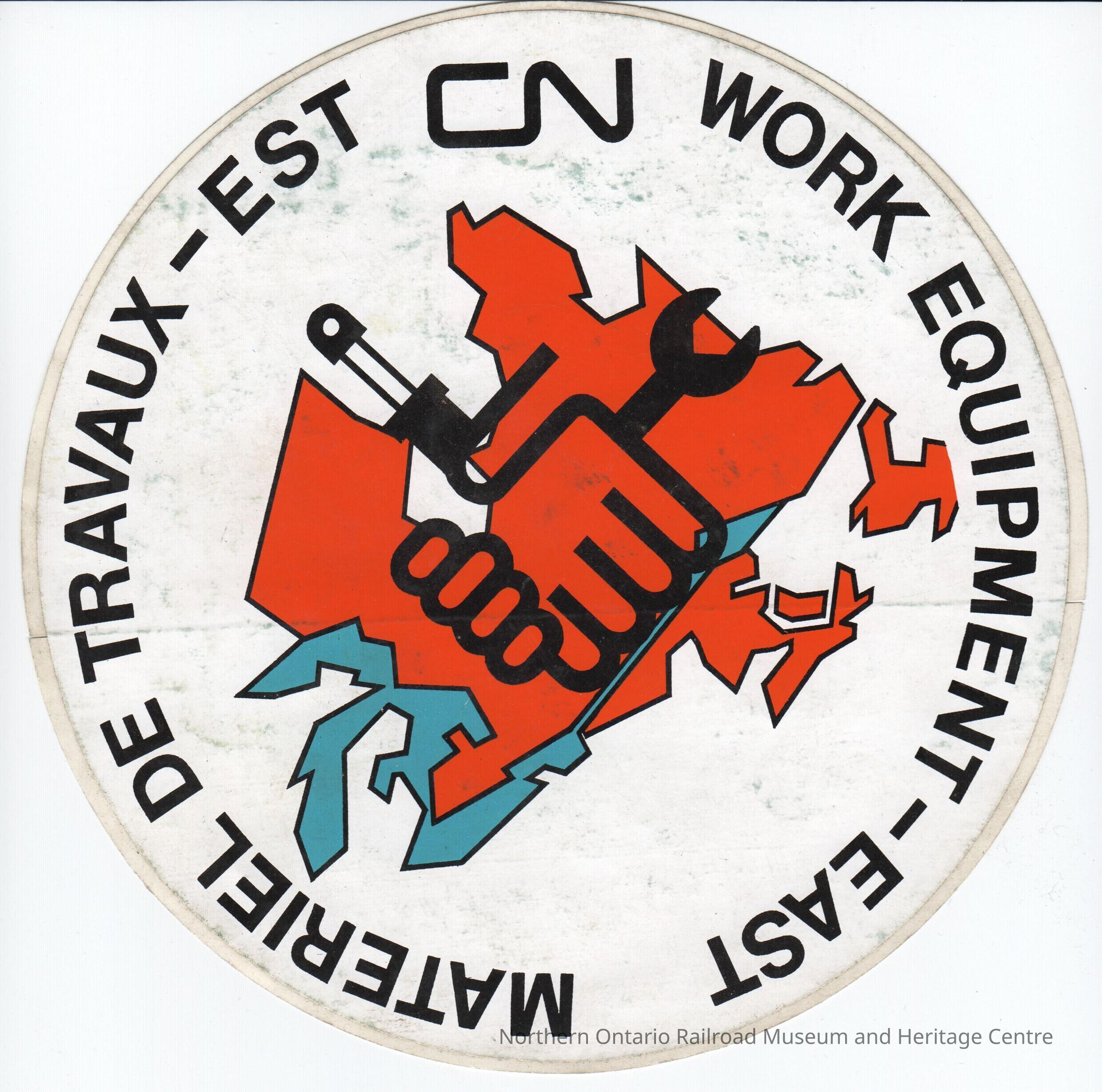 Large, round sticker. White background with the words "CN WORK EQUIPMENT - EAST MATERIEL DE TRAVAUX - EST" in black around the perimeter. An orange and blue graphic is in the center, with an outline of a hand and wrench in the center.Collection