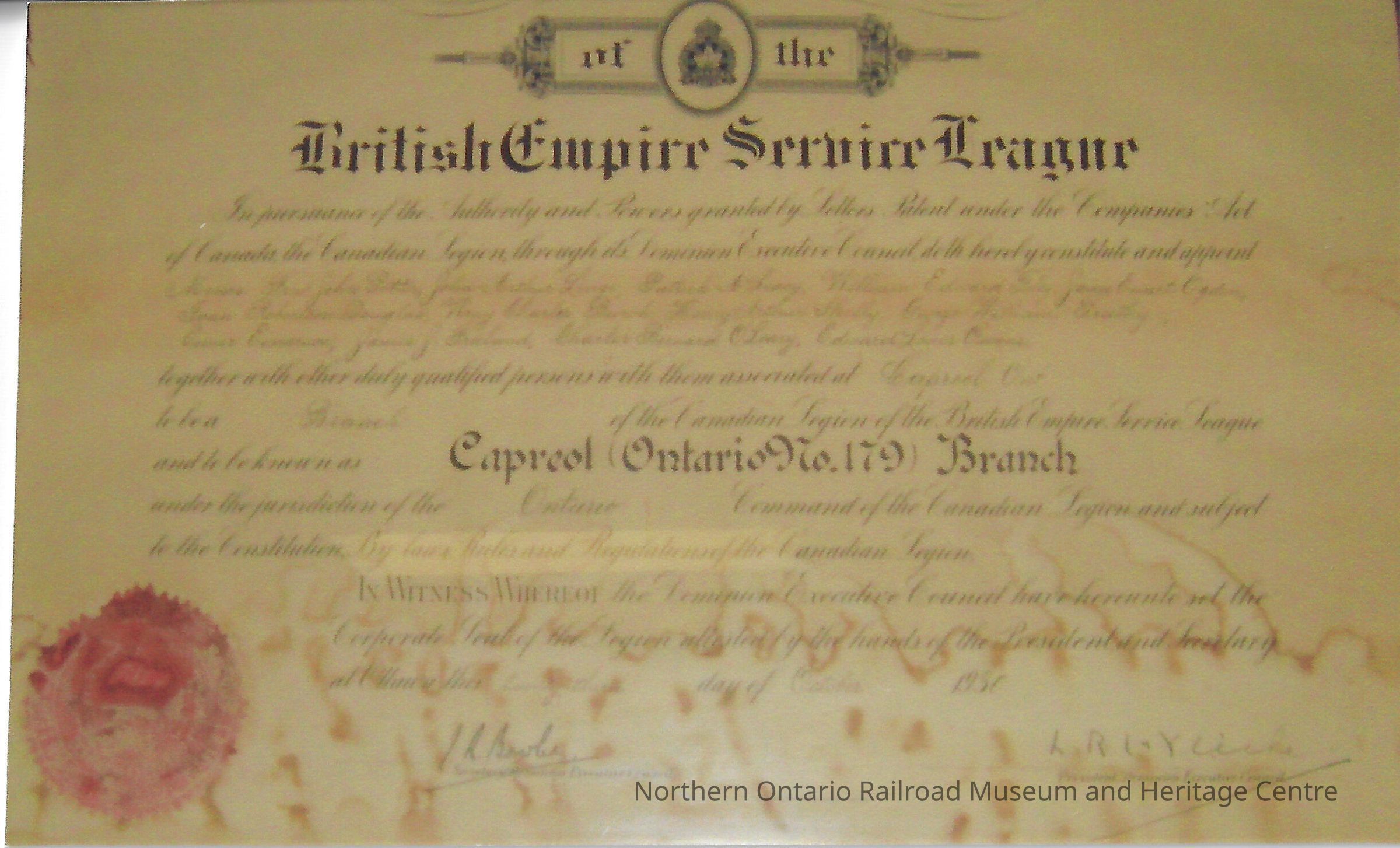 A photograph taken by Eileen Thompson of a British Empire Service League Certificate Capreol No. 179 Branch (photo of the original copy, which is hanging in the Capreol Royal Legion). Certificate grants Command of the Canadian Legion in Capreol Ontario. There is an original official red seal at the bottom, which has suffered significantly from water damage. Print is faded and difficult to read.Collection