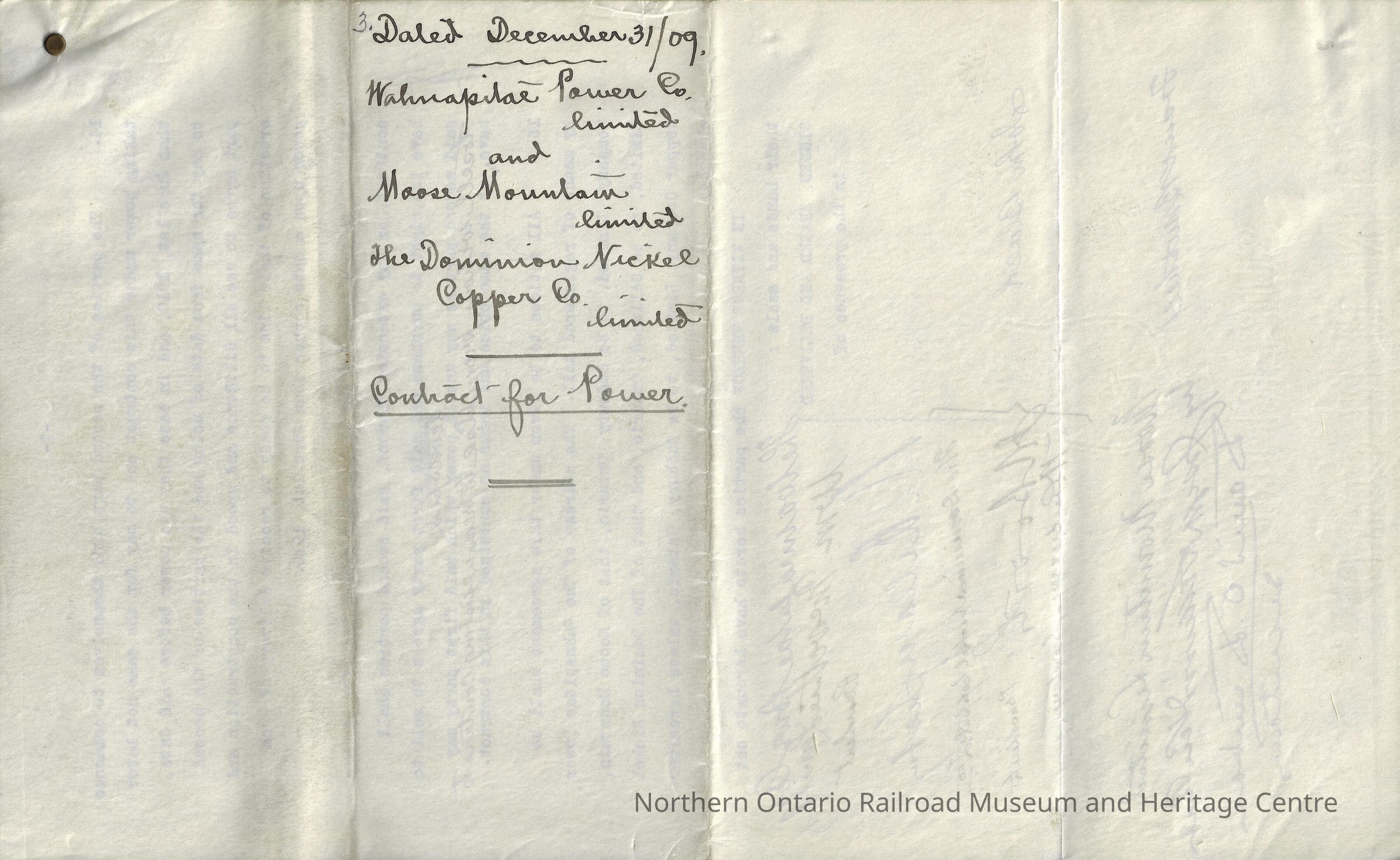 2019.003.001a-g: The Whanapitae Power Company Ltd., Moose Mountain Ltd., and The Dominion Nickel Copper Company Ltd. Contract for Power,December 31st 1909.