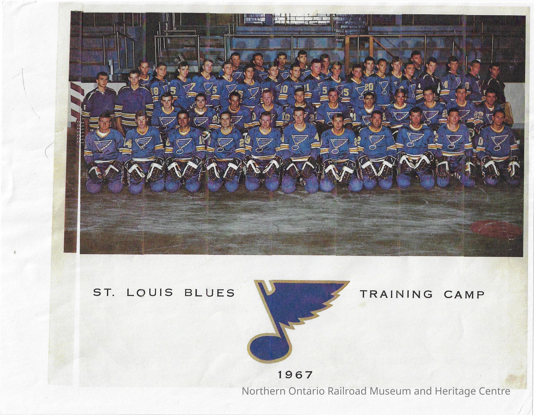 Copy of a colour photograph of the St. Louis Blues Training Camp in 1967. Players are posed on the ice in blue St. Louis Blues jerseys, arranged in four rows. There is no identifying information to accompany the photo, but Ron Hindson has been identified sitting in the first row, 6th from the left.Context