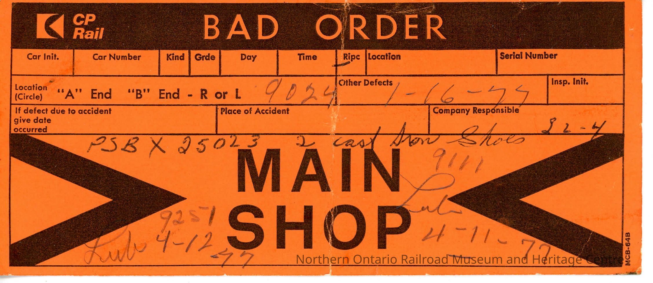 Cp Rail Bad Order from Main Shop (1-16-77). Order details:
