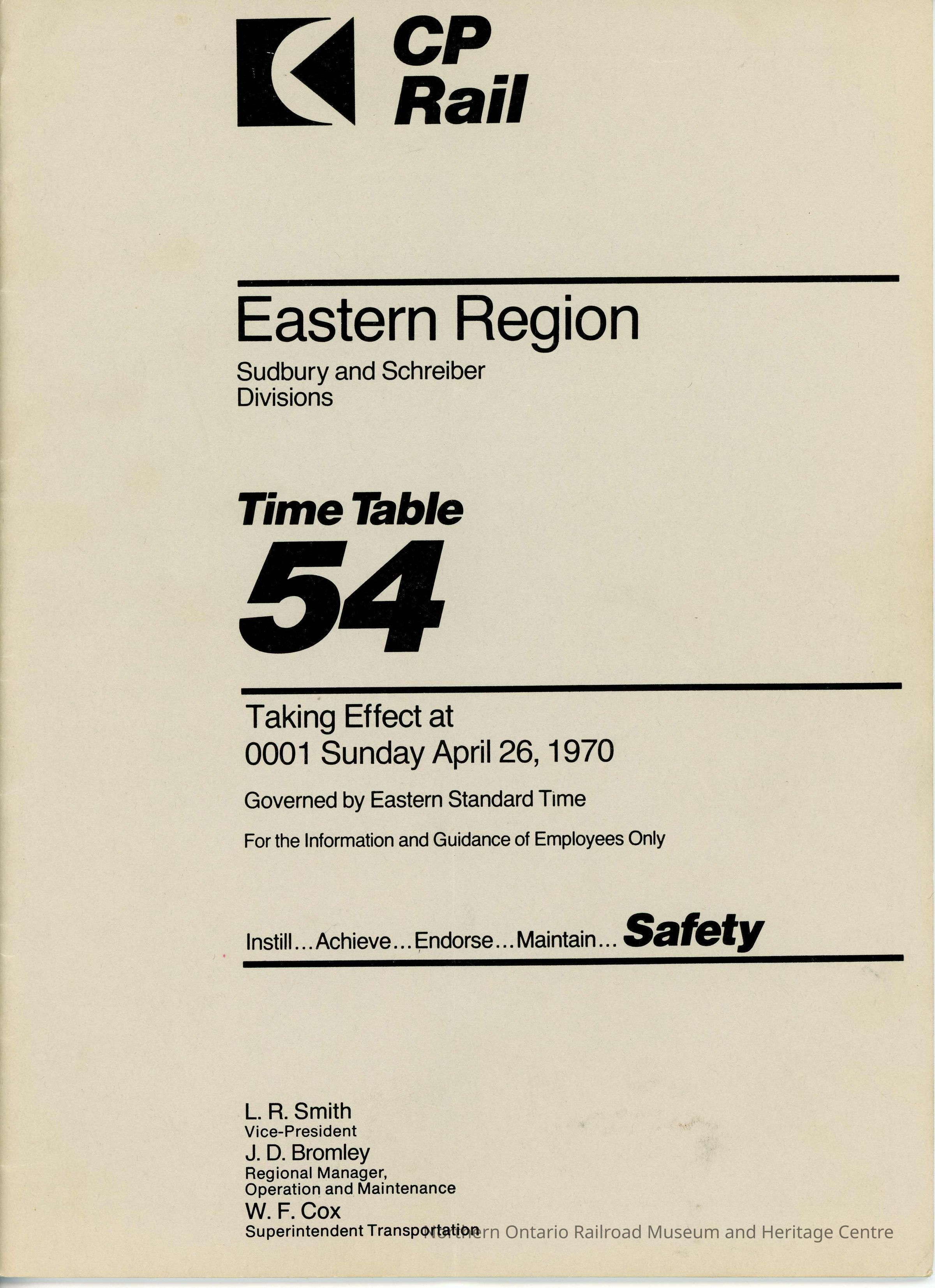CP Rail Eastern Region (Sudbury and Schreiber) Timetable 54 for April 26 1970, effective 0001 ESTDescription