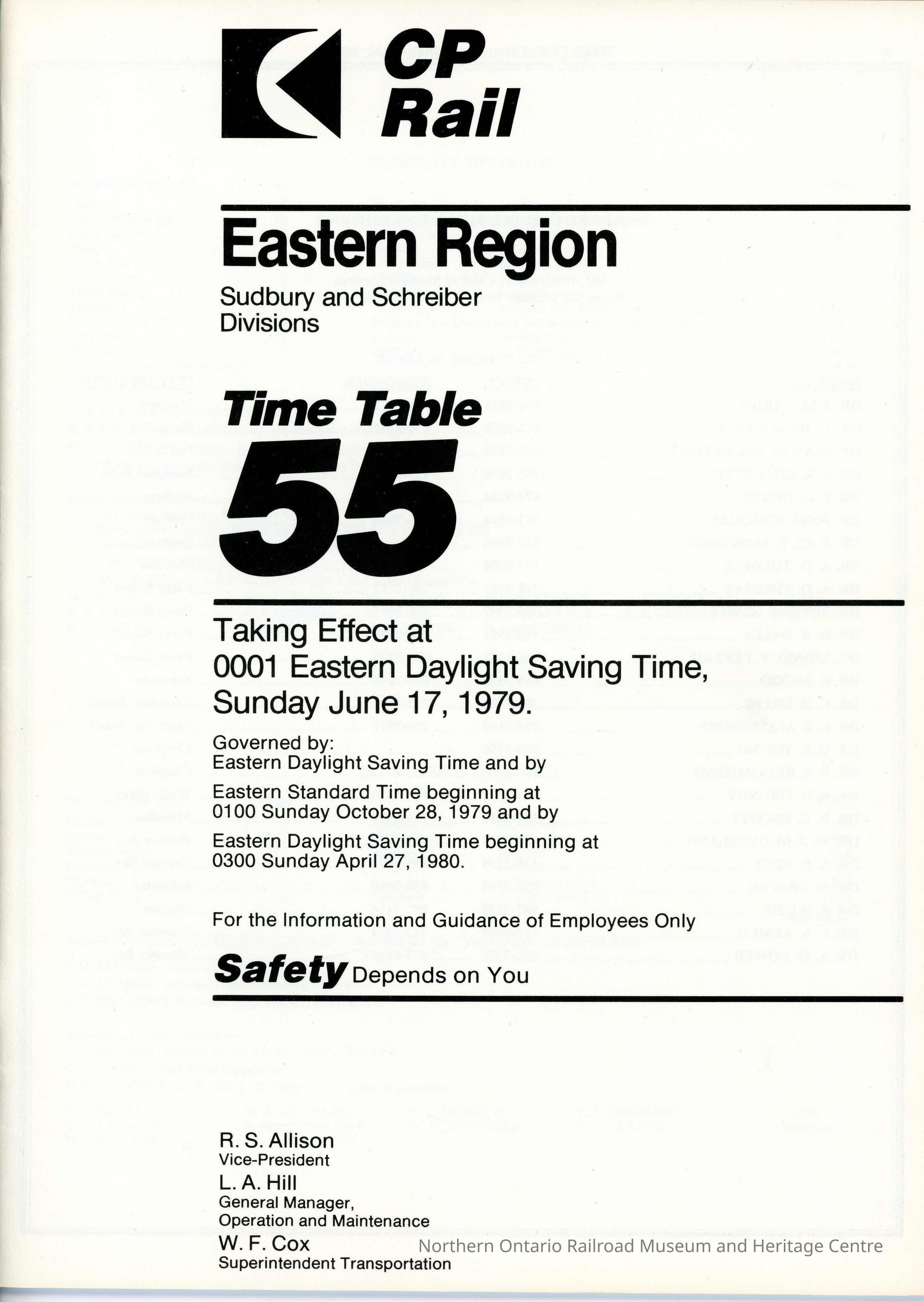 CP Rail Eastern Region (Sudbury and Schreiber) Timetable 55 for June 17 1979, effective 0001 EDSTDescription