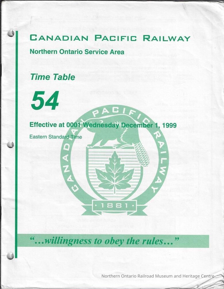 CP Rail Northern Ontario Service Area Timetable 54Entry/Object ID