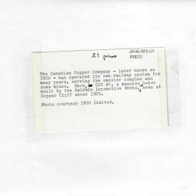 "The Canadian Copper Company - later known as INCO - has operated its own railway system for many years, serving the smelter complex and some mines. Here, CCC#1, a massive 0-6-0 built by the Baldwin Locomotive Works, ^ is seen at Copper Cliff about 1905.