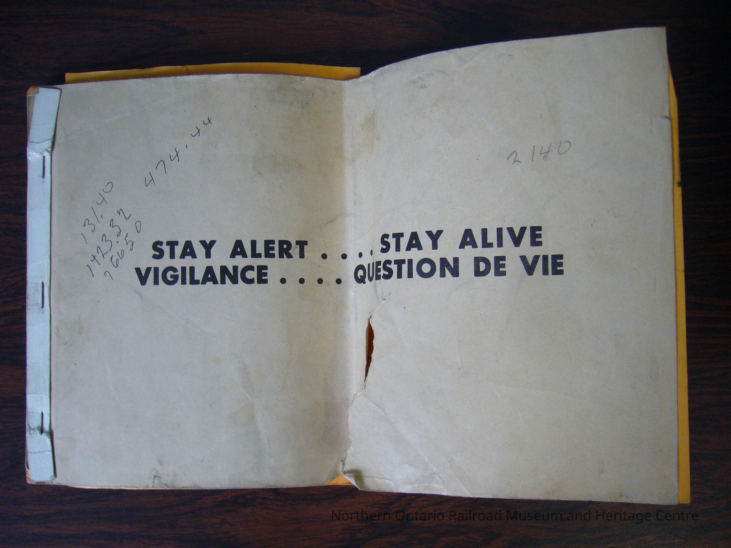 Book of orange CN forms noting the time return of yardmen. Thirteen of the book's forms have been filled out. The carbon copy remains in the book. Signed by foreman J.T. Stewart. Also noted is L.A. Villeneuve. On the cover, the words "Stay Alert...Stay Alive / Vigilance...Question de vie" are printed in bold black letters.Collection
