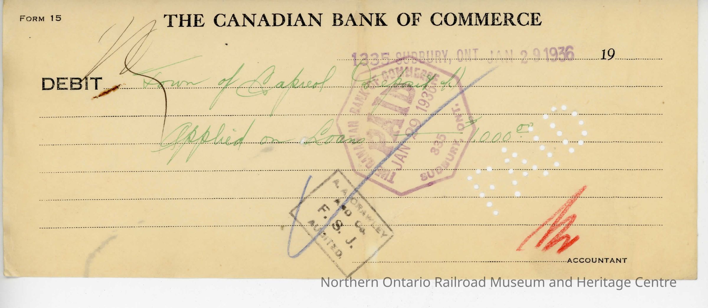 Debit charge slip for the Town of Capreol's account deposited on January 29th, 1936 for $1000.00 to be applied on loans. The slip was for the Canadian Bank of Commerce and was deposited at branch 1335 in Sudbury Ontario.