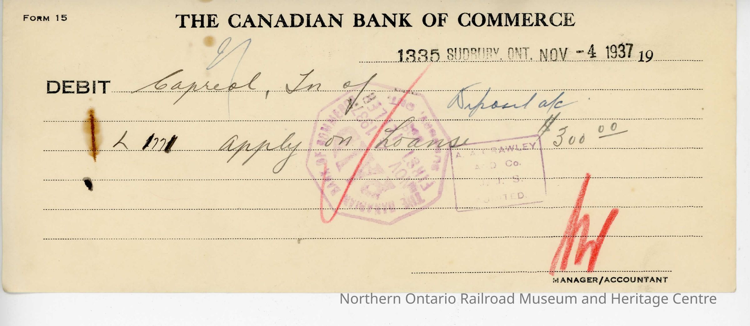Original document, original debit charge slip for the Town of Capreol for the amount of $300.00 in 1937.Collection