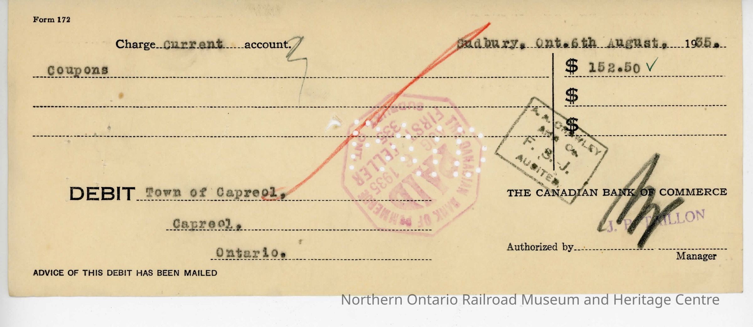 Debit Charge Slip to the Town of Capreol's Account, coupons, $152.50, 1935Entry/Object ID