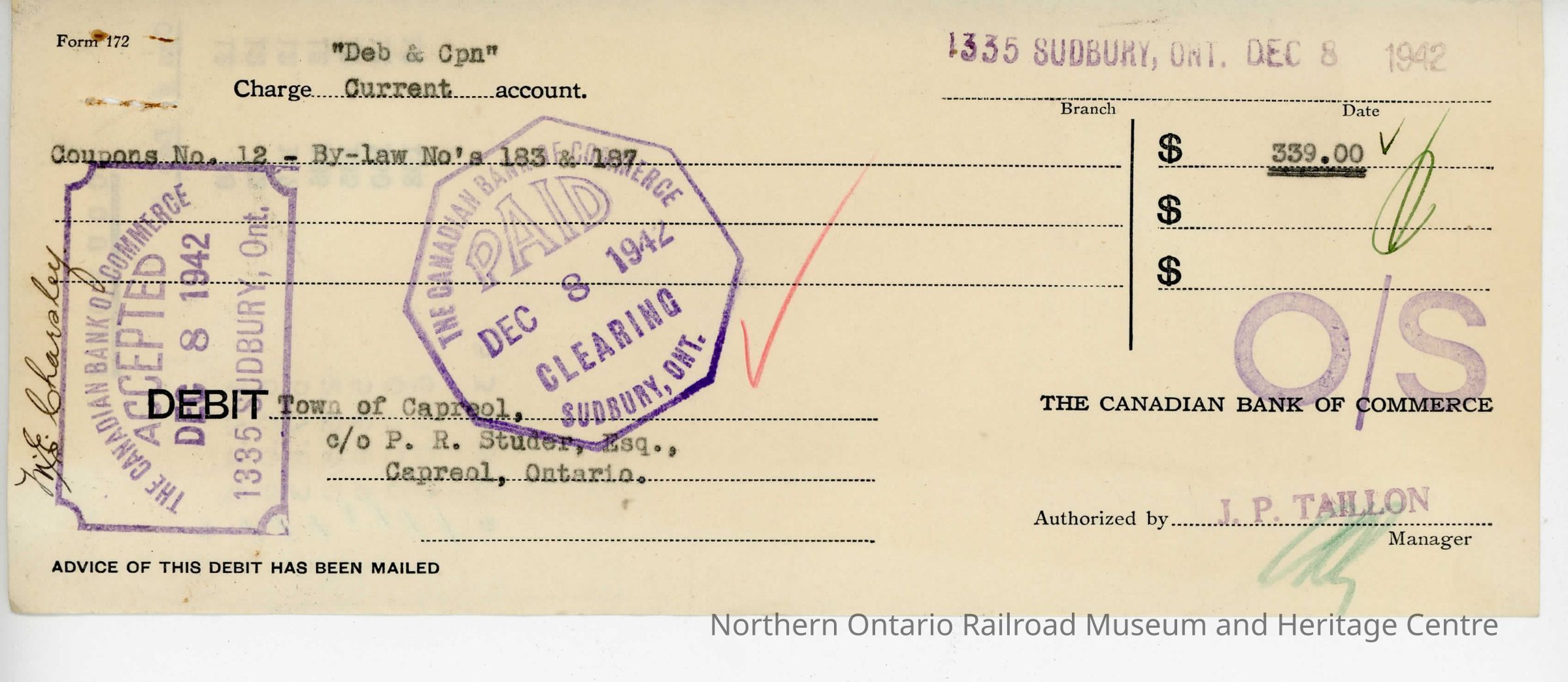 Debit Charge Slip to the Town of Capreol's Account,Coupons No. 12 - By-Laws Nos. 183 &187, $339.00, 1942Entry/Object ID