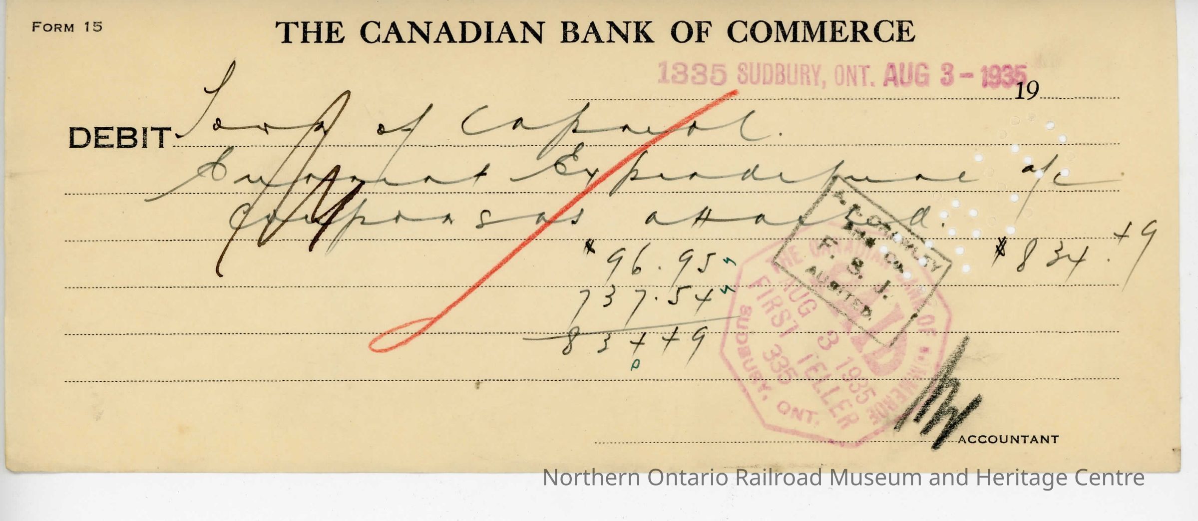 Original document, original debit charge slip for the Town of Capreol for the amount of $834.49 in 1935Collection