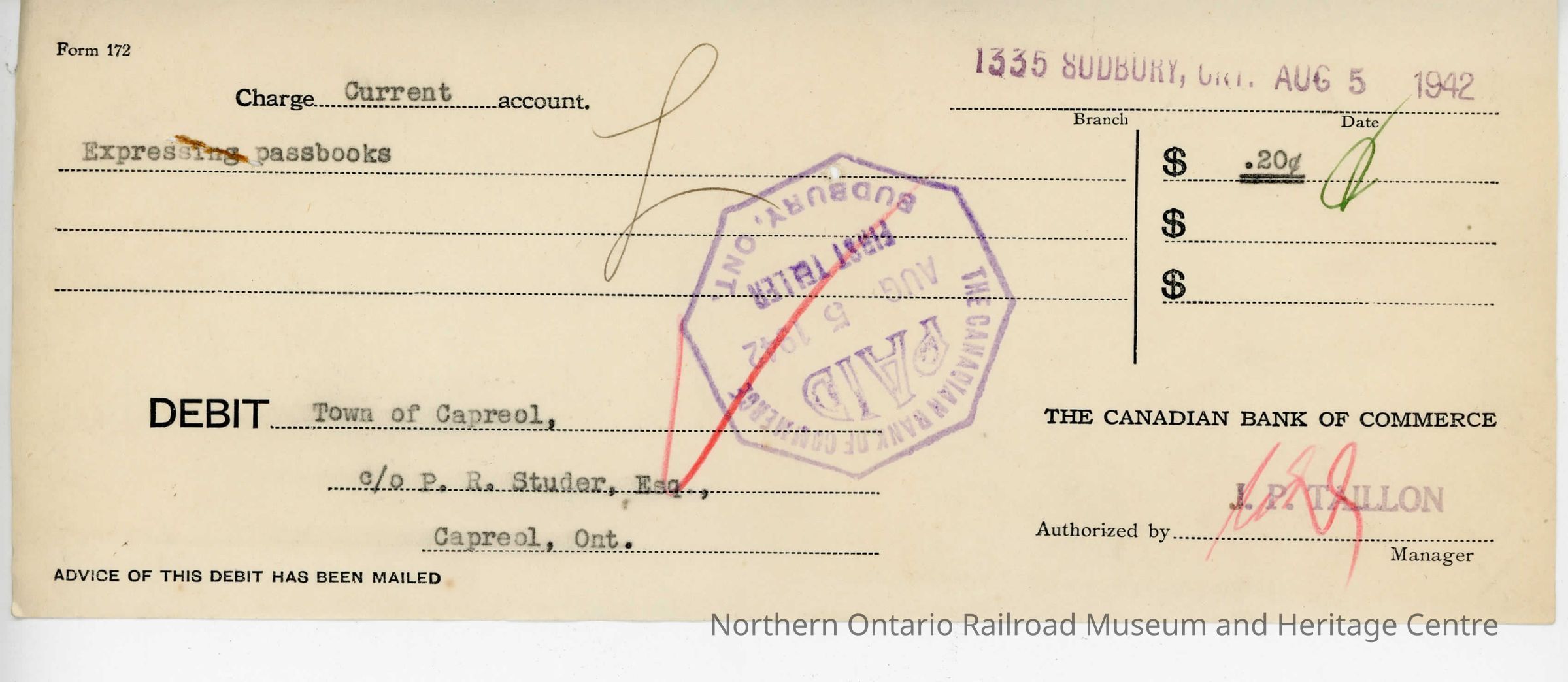 Debit charge slip for the Town of Capreol's account deposited on August 5th, 1942 for $0.20, for expressing passbooks, to be paid to Canadian National. The slip was for the Canadian Bank of Commerce and was deposited at branch 1335 in Sudbury Ontario.