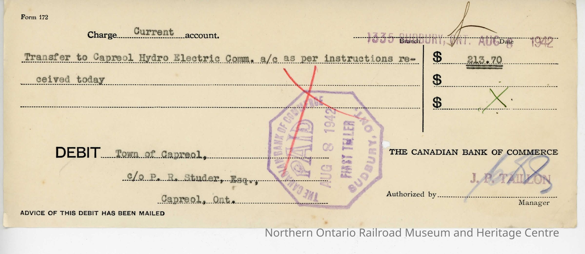 Debit charge slip for the Town of Capreol's account deposited on August 8th, 1942 for $213.70 to be transferred to the Capreol Hydro Electric Commission. The slip was for the Canadian Bank of Commerce and was deposited at branch 1335 in Sudbury Ontario.