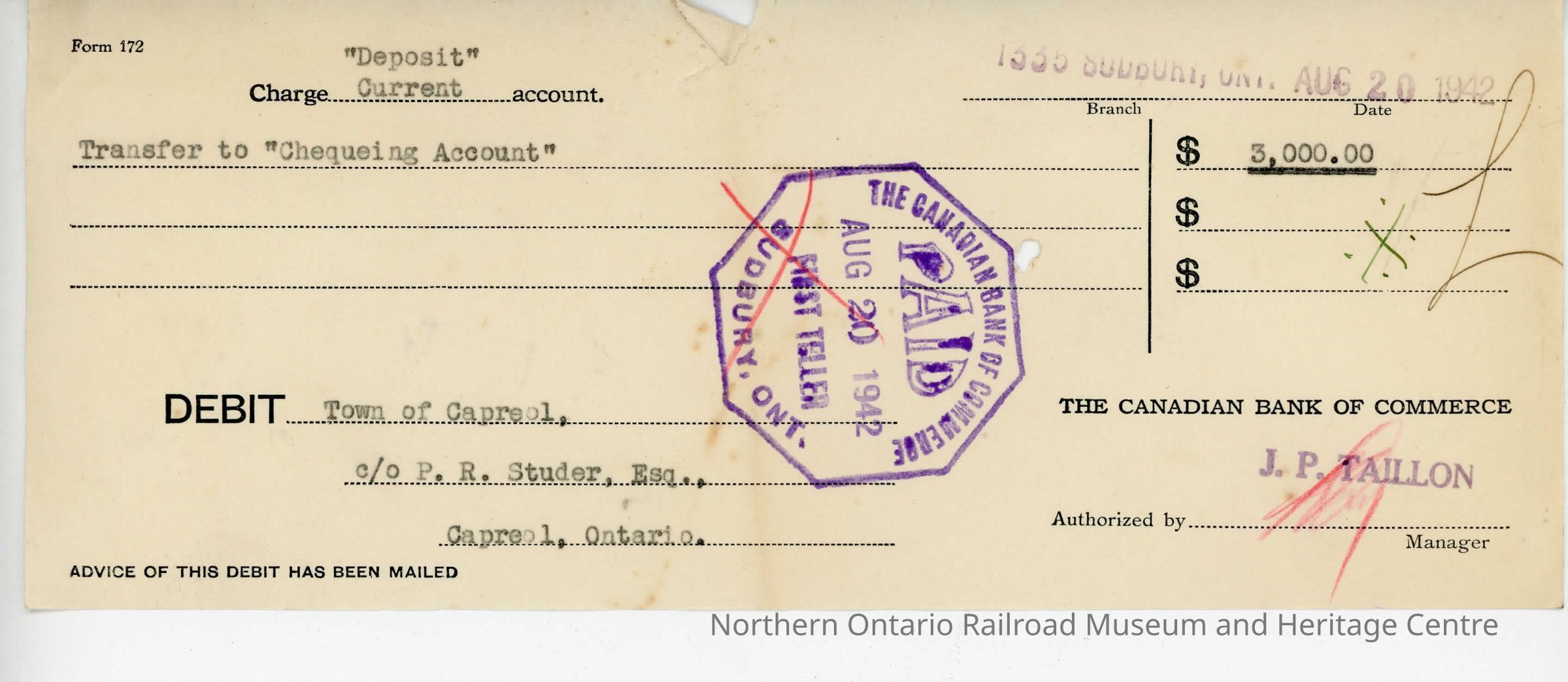 Debit charge slip for the Town of Capreol's account deposited on August 20th, 1942 for $3,000.00 to be transferred to chequing account. The slip was for the Canadian Bank of Commerce and was deposited at branch 1335 in Sudbury Ontario.