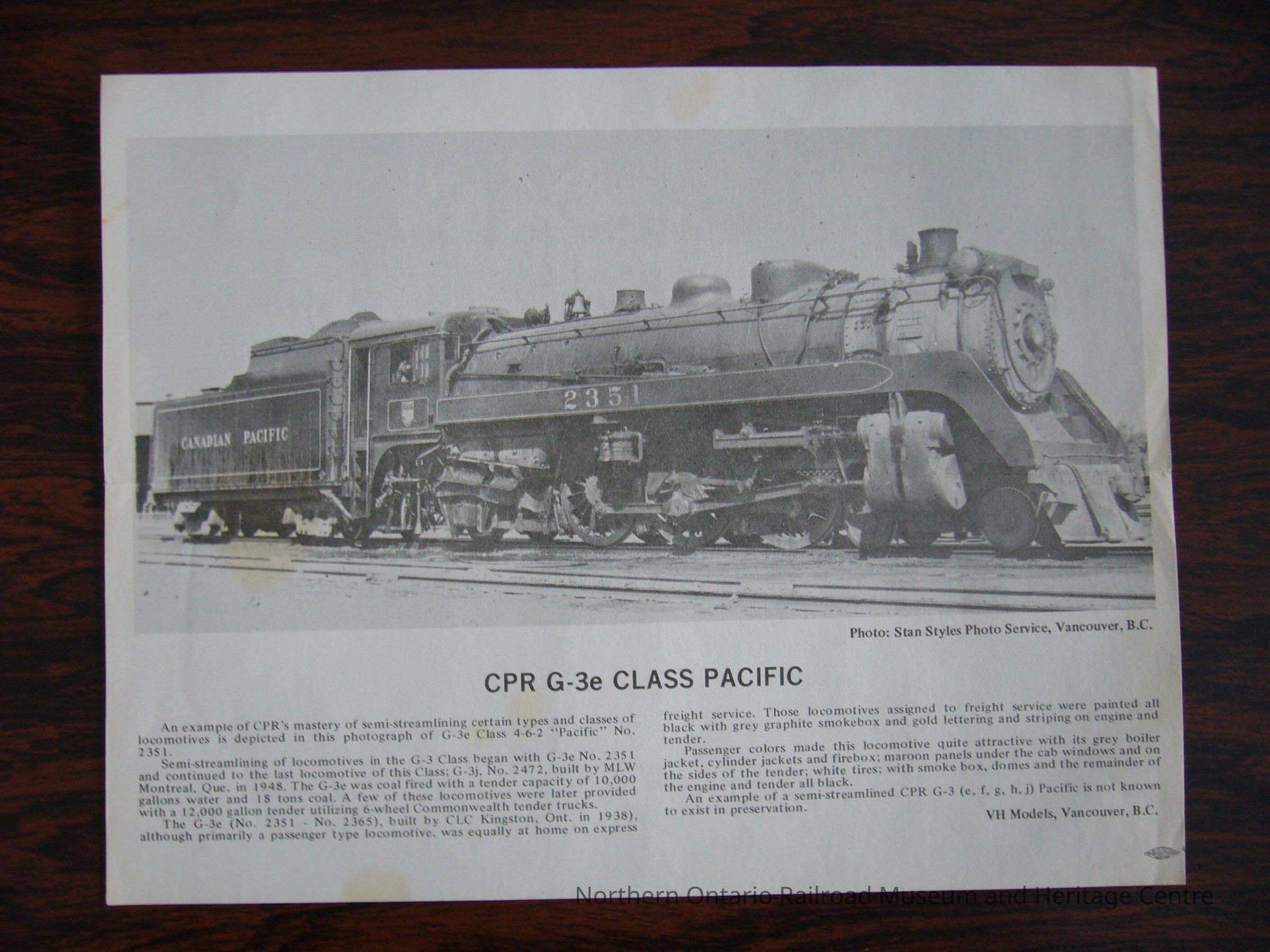 A short description of CPR G-3e Class Pacific type locomotive, including a black and white reproduction of a photograph by Stan Styles.Collection