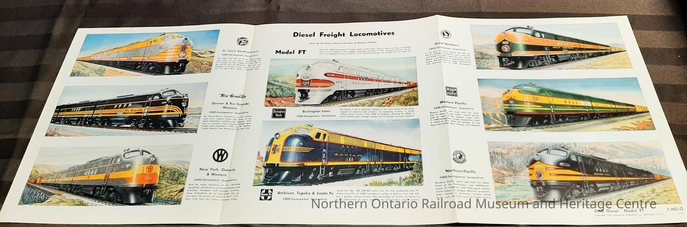 Poster of coloured prints of the General Motors Corporation's diesel freight locomotive Model FT. The poster shows eight major US railway corporations who use the Model FT with a description of why each corporation started using the new model.